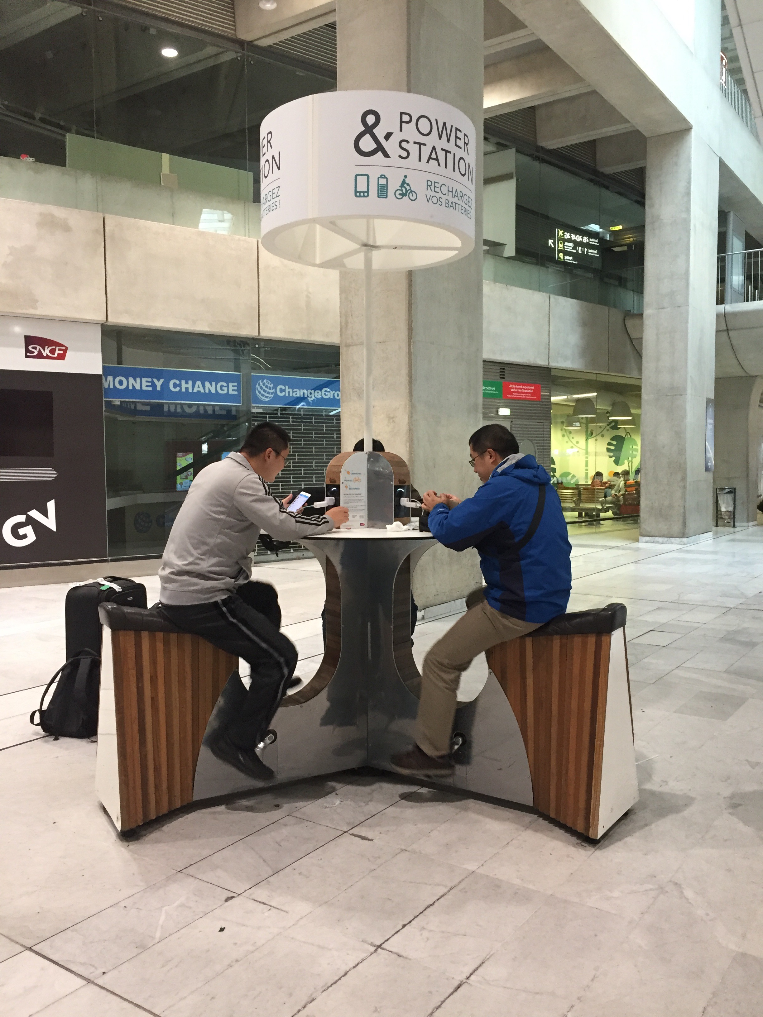 The cell phone charging stations at the CDG airport were pedal powered. What a good idea to stretch your legs while charging your phone or laptop.
