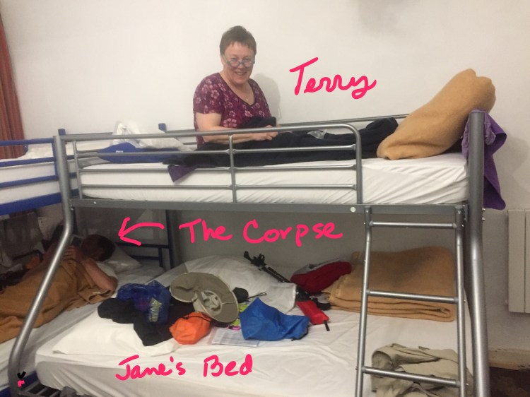 The joy of bunk beds! Our dorm room had about 8 bunks. It was weird having that person so close to my bunk. We’ve been calling him “The Corpse”. He was laying in bed when we arrived and still laying in bed when we left. He talks French in his sleep and in English on the trail.
