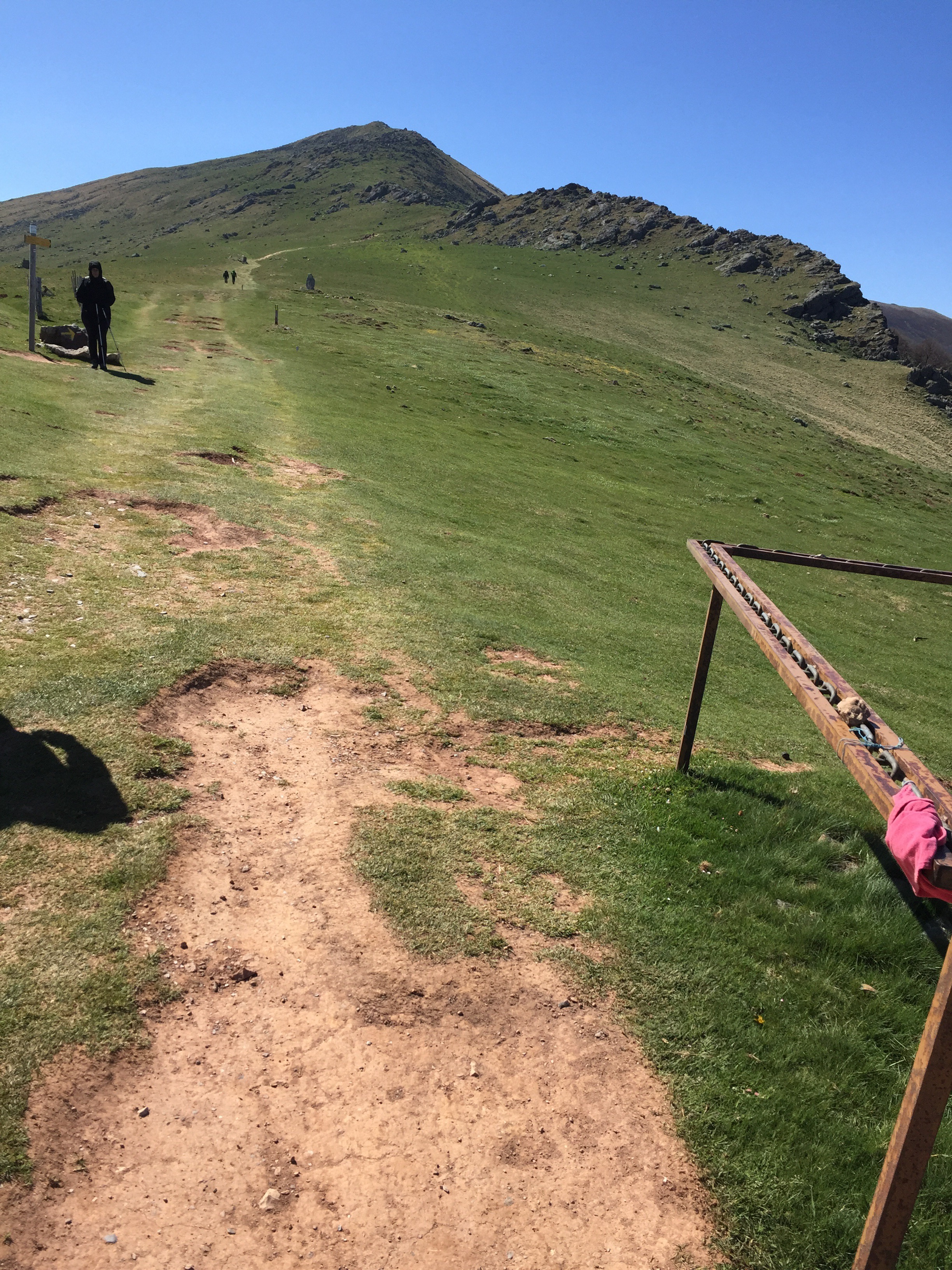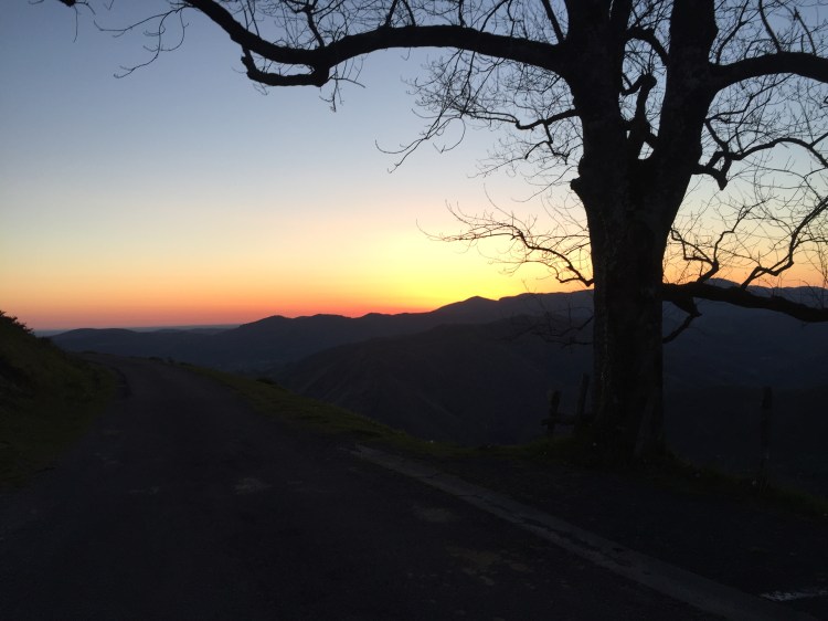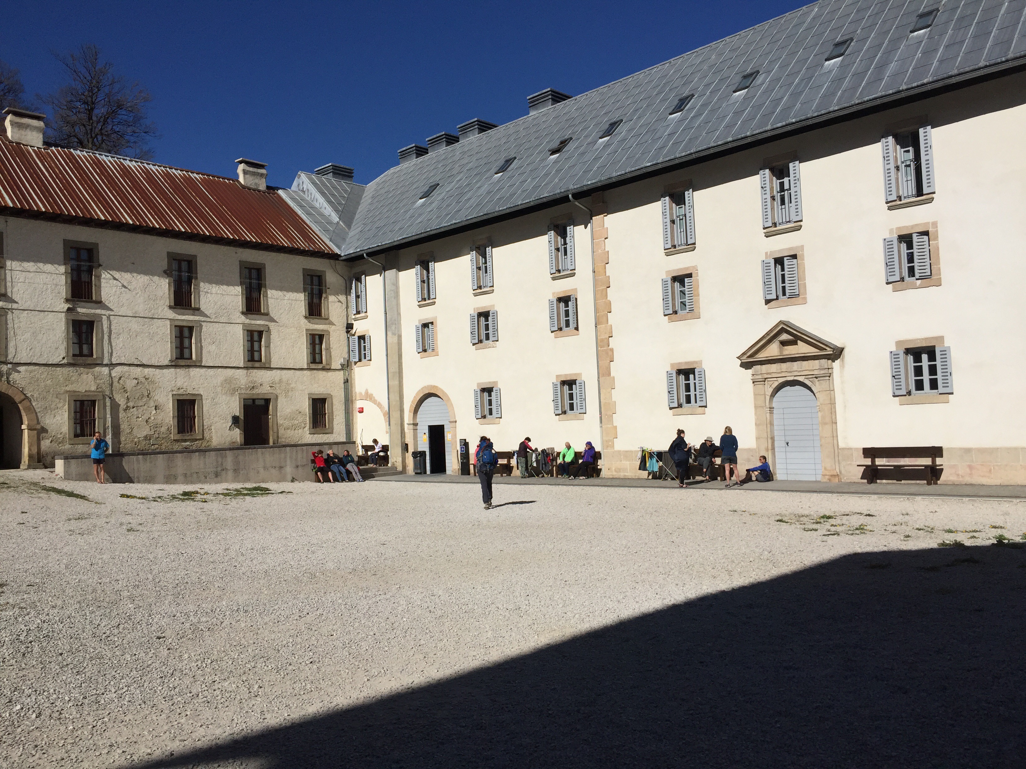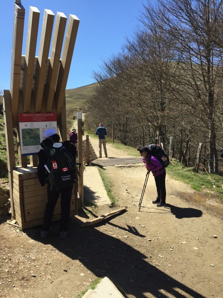 Lights on at 6am. Everyone was up and moving. Beautiful sunrise over the Pyrenees. We trudged up our first hill. Had a wonderful rest at the Virgin of Orrison. There were a few families camped there. Lots of kids and the women were all wearing skirts even the little girls. The hillside was dotted with battle stations left from WWII. They were stone structures that two people could stand behind and shoot from. Very eerie to see. This was a very gruesome and bloody battle between the Spanish and the Germans. I can’t imagine fighting a war in this terrain. We crossed the Spain/France border. Rugged trail with lots of steep and gravely downhill. We were exhausted when we came to the monastery in Roncevalle. It is an Albuergue that holds over 200 people. We were ;late so we got the luxury accommodations on the third floor — no bunk beds. We had a lovely dinner at the Roncevalle hotel. Lots of paella, pork and leche cake. At the Albuergue, my cell mate was Francesca from Italy and Terry had a Korean woman.