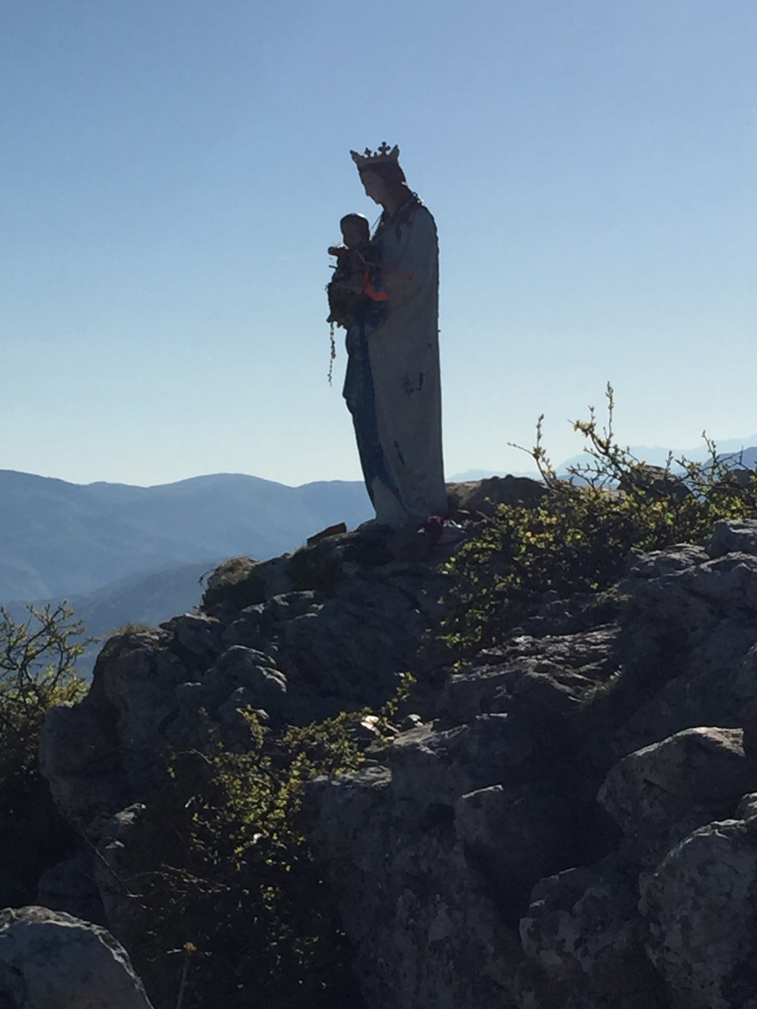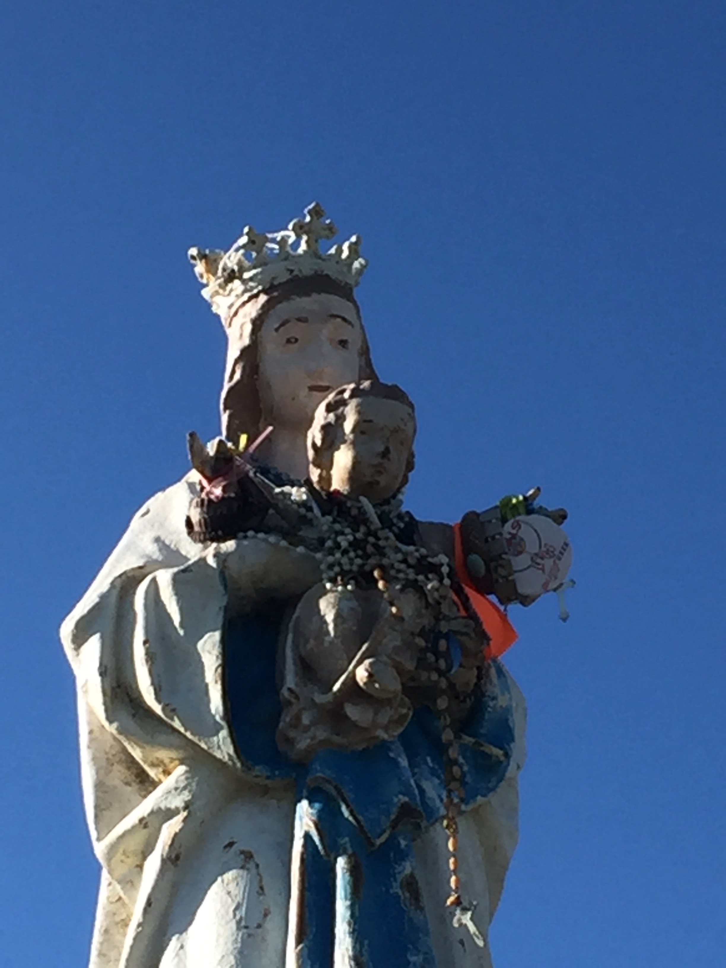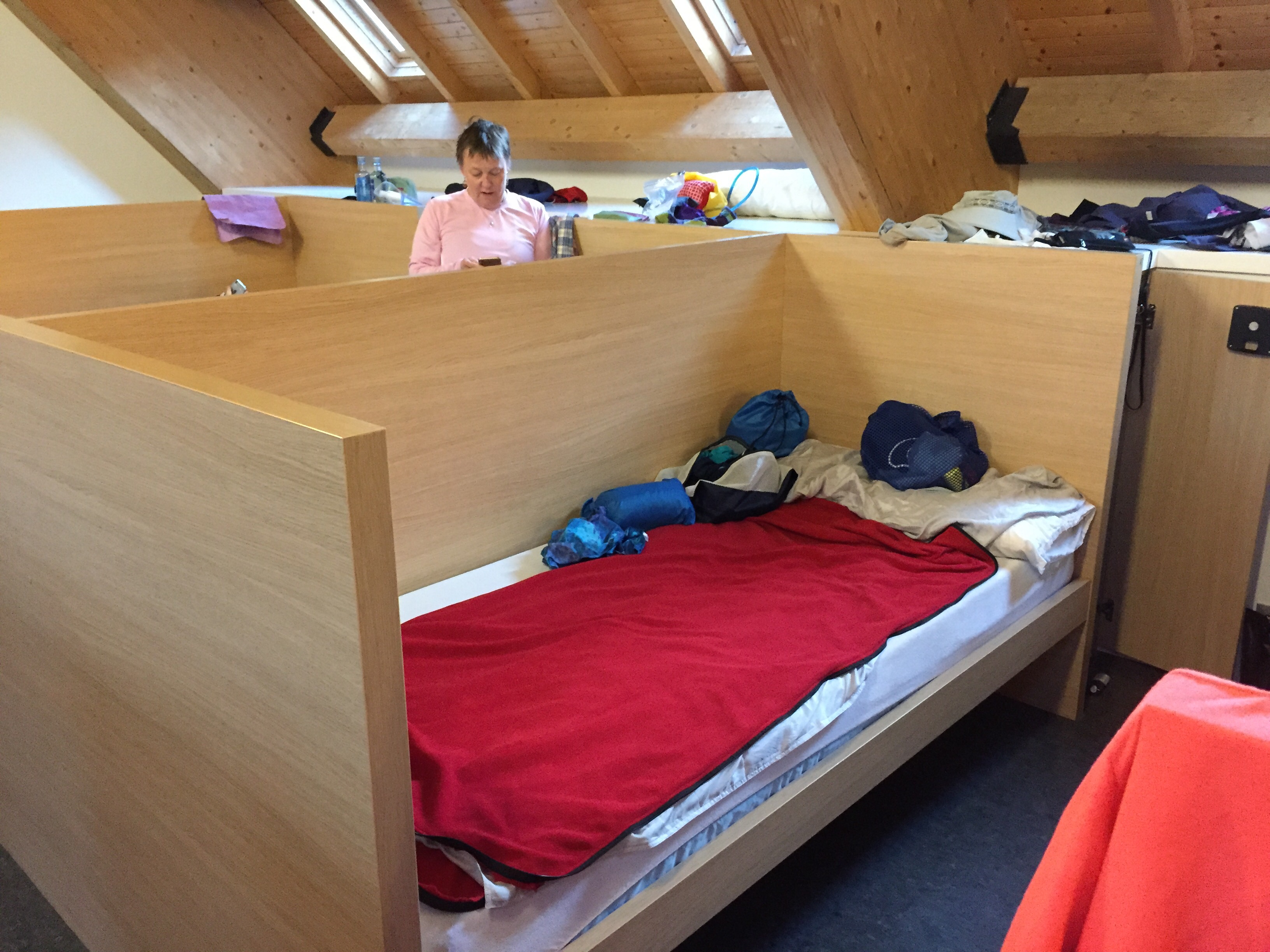 Lights on at 6am. Everyone was up and moving. Beautiful sunrise over the Pyrenees. We trudged up our first hill. Had a wonderful rest at the Virgin of Orrison. There were a few families camped there. Lots of kids and the women were all wearing skirts even the little girls. The hillside was dotted with battle stations left from WWII. They were stone structures that two people could stand behind and shoot from. Very eerie to see. This was a very gruesome and bloody battle between the Spanish and the Germans. I can’t imagine fighting a war in this terrain. We crossed the Spain/France border. Rugged trail with lots of steep and gravely downhill. We were exhausted when we came to the monastery in Roncevalle. It is an Albuergue that holds over 200 people. We were ;late so we got the luxury accommodations on the third floor — no bunk beds. We had a lovely dinner at the Roncevalle hotel. Lots of paella, pork and leche cake. At the Albuergue, my cell mate was Francesca from Italy and Terry had a Korean woman.