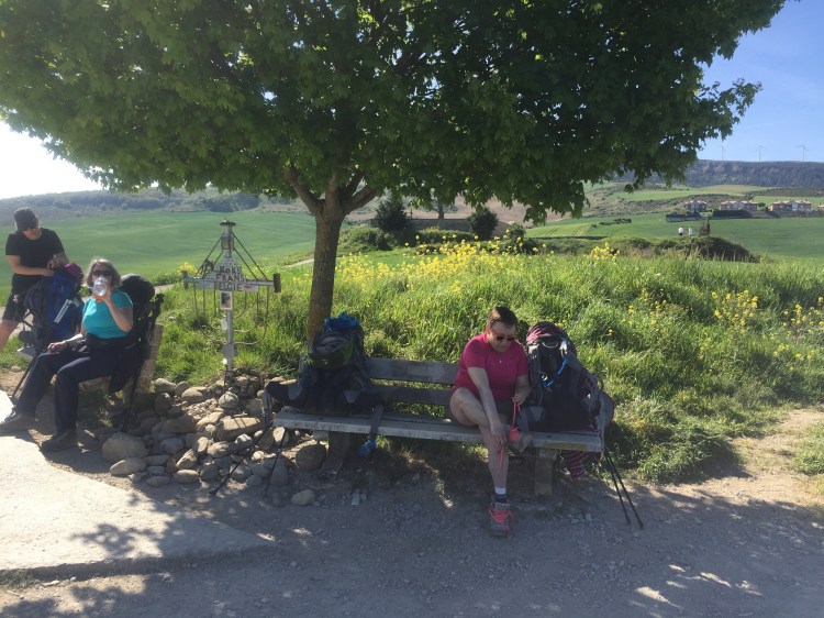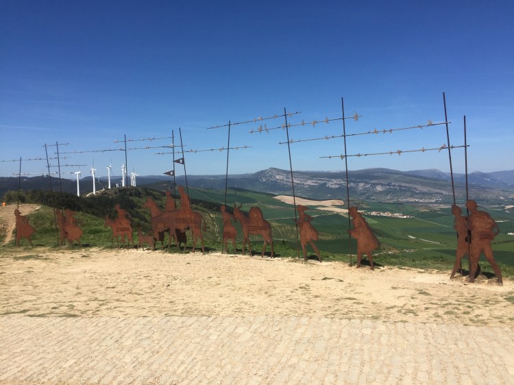 This is Alto Del Perdon, “Mount of Forgiveness”. The climb up is an arduous one. This iconic sculpture is dedicated to all the pilgrims who walk the Camino. The long metal sculpture representing pilgrims on foot and on horse reflects the historic and eternal nature of the walk. There is a Spanish inscription on it, “donde de cruza el camino del viento con el de las estrellas” meaning “where the path of the wind crosses that of the stars.”
