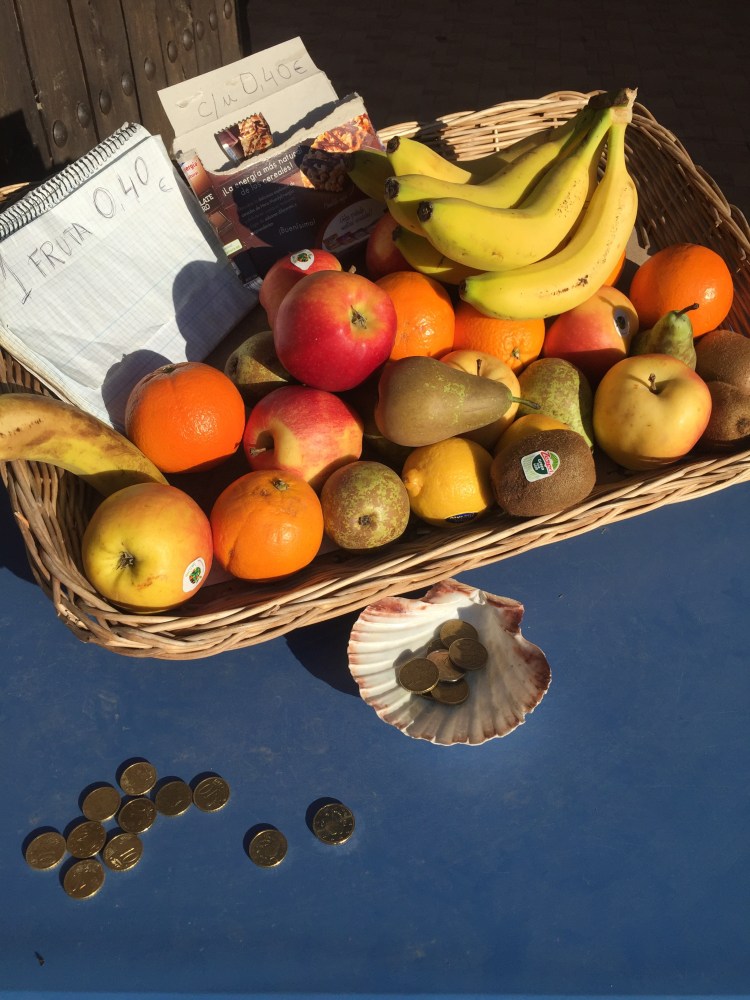 Camino honor system. People were nice enough to leave out fruit and beverages for the early morning pilgrims. You would just take what you wanted and leave the payment in the shell.