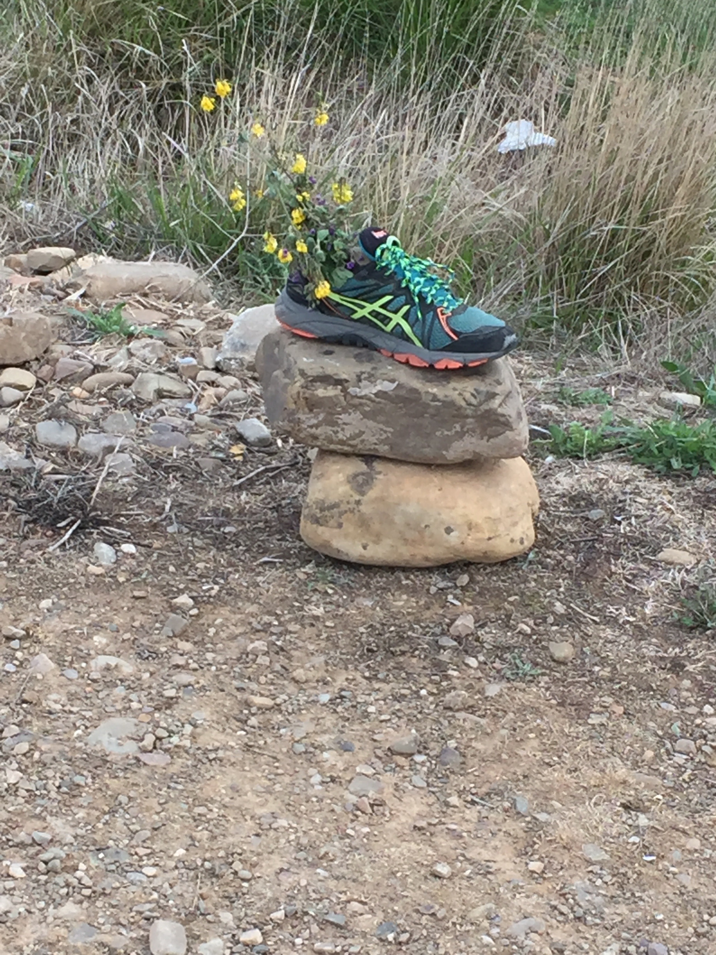Camino people love dual purpose — when the shoes wear out, make a trail marker out of them.
