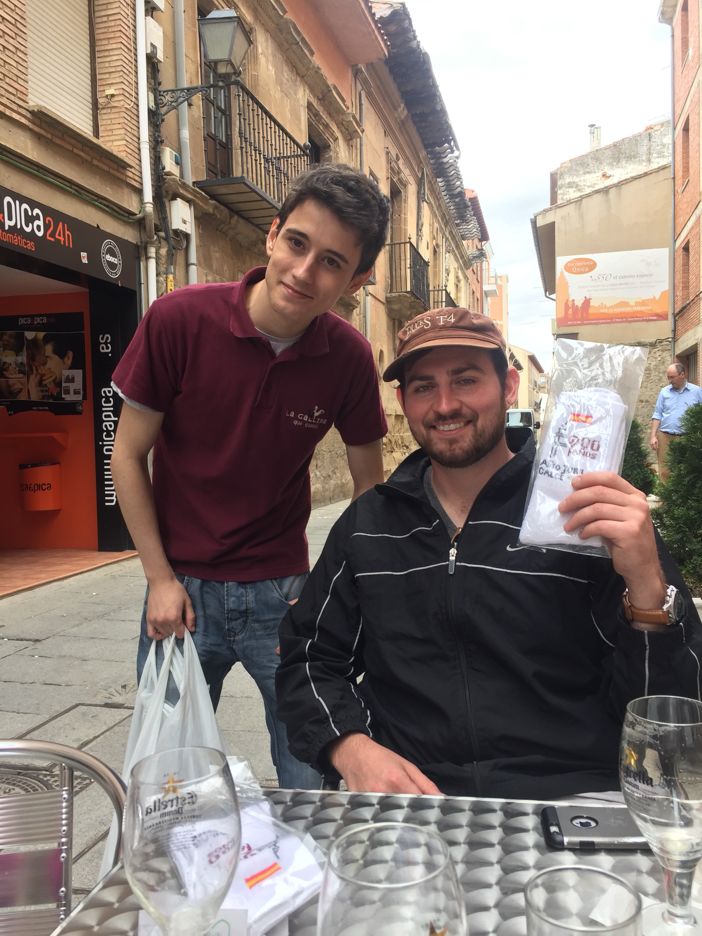We were having a beer and the bartender ran out and wanted to know what size socks we wore. He gave us a free pair of “900 year anniversary” (of Santo Domingo) socks … a freebie. A little odd but we loved it. I’m getting the feeling that Santo Domingo is a very strange town with lots of oddities …. the hanging man cookie, the Rooster in the cathedral and happy hour socks. Quinn posed with the bartender and his new socks.