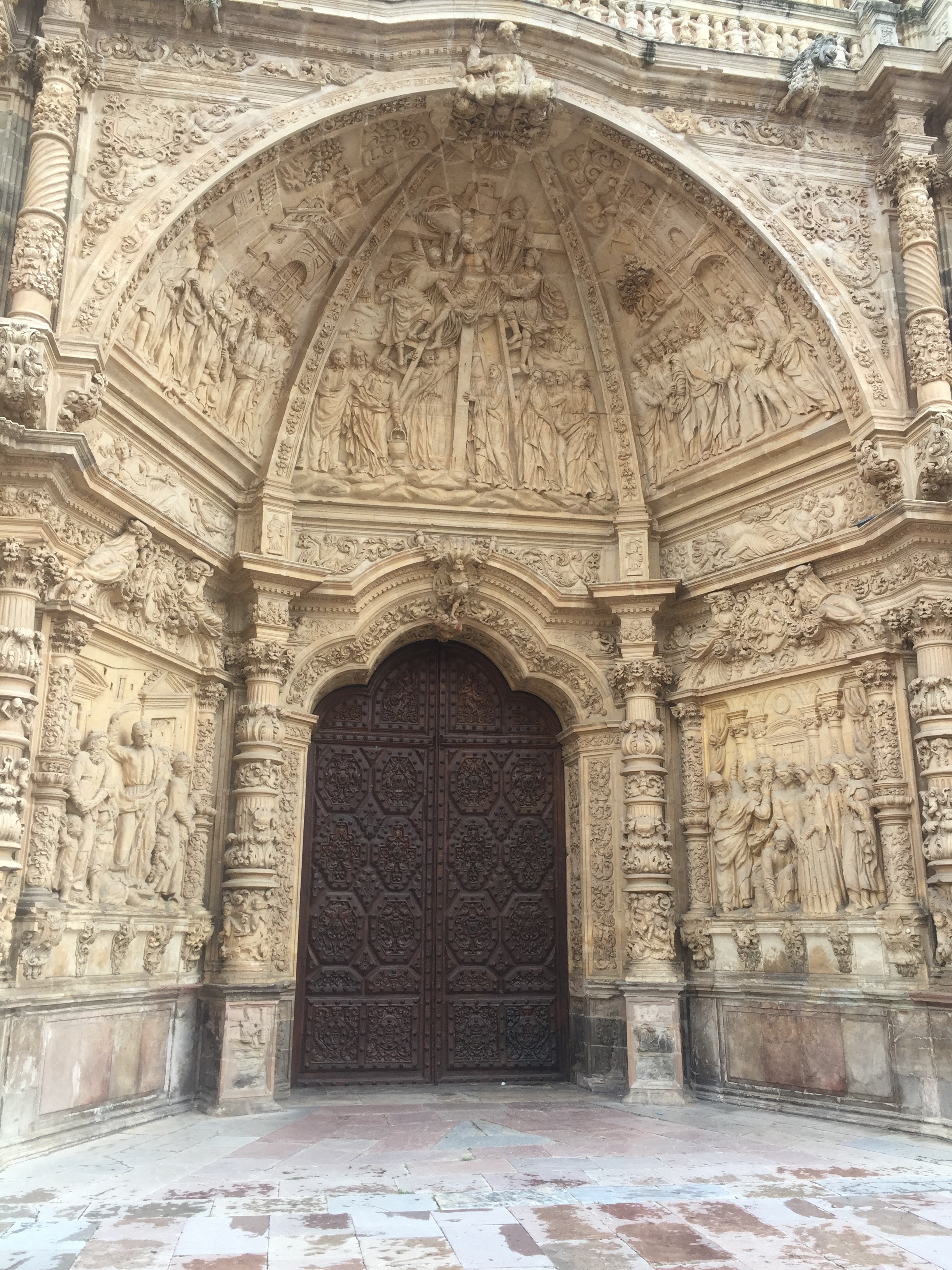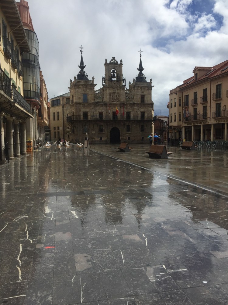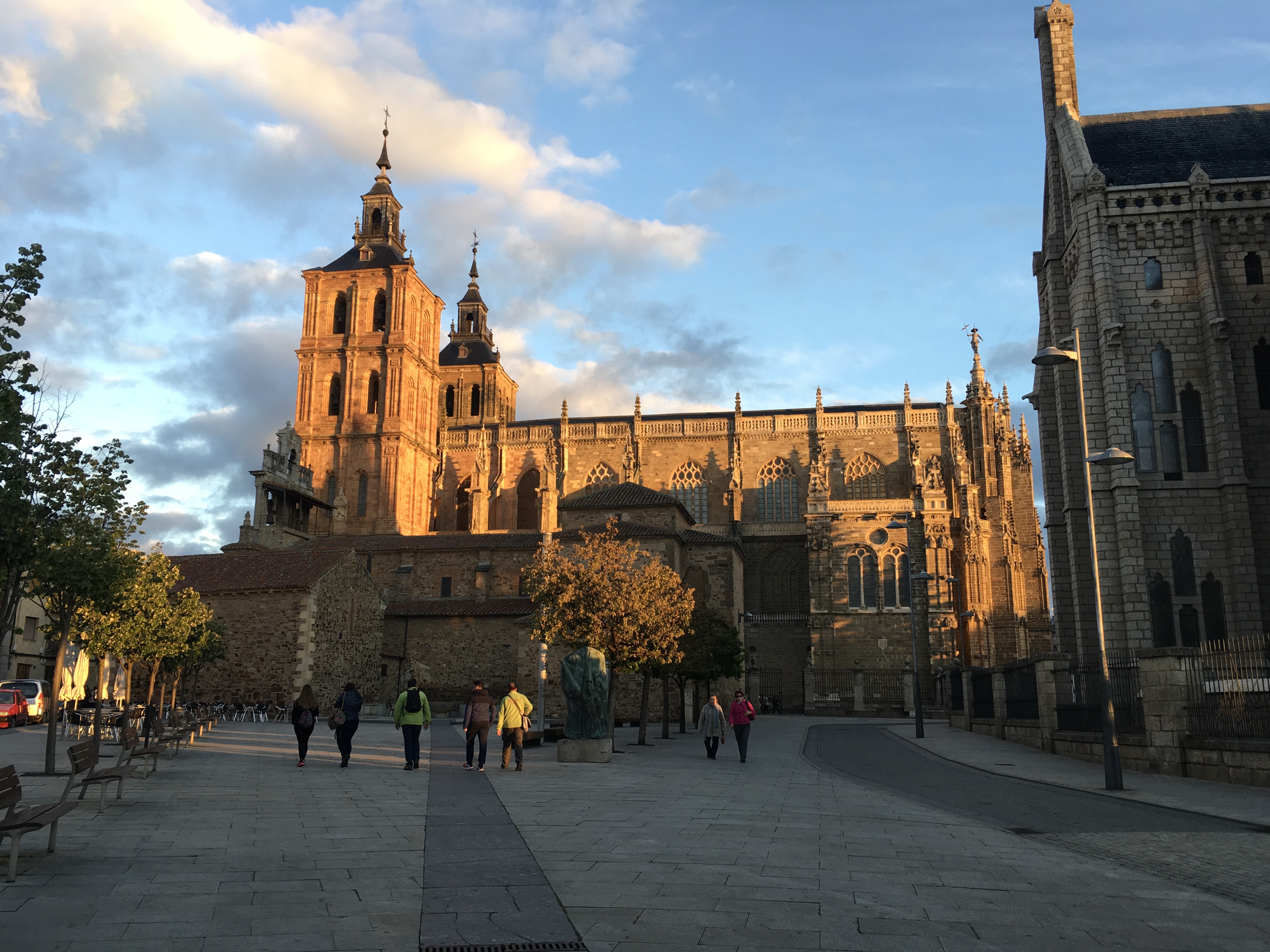 The segment of the Camino we are at now is called the Meseta. My guidebook says it has a reputation for being, “boring, repetitive and bleak.” It’s flat, all sun and we’ve been told it’s similar to walking through Nebraska. Other pilgrims have confirmed this and also talked about the mental agony it creates. Taking all of this into consideration, we decided to morph ourselves through the Meseta. We enjoyed seeing it from the window of our comfortable bus which was full of our fellow pilgrims doing the same thing. The short three hour bus trip bought us eight days which is how long it would have taken us to walk the Meseta. We also learned that the winds were very strong and caused many to stop walking. We were happy, delighted and energized when we arrived in Astorga which sits on a hill. The Cathedral is prominent and it was our first stop.
