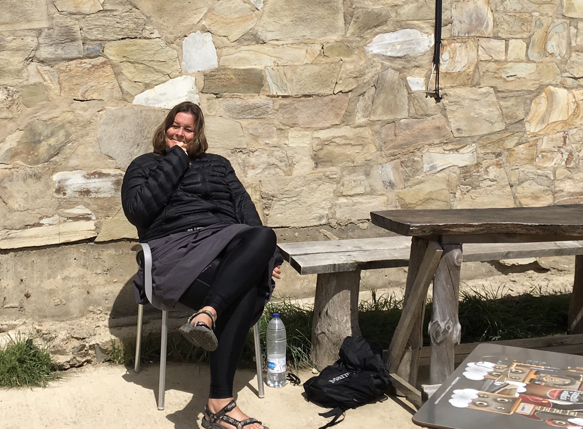 This is Moon from Sol, Korea. She was seriously thinking about staying at the Manjarin Albergue. She walked round a little and then we heard the sound of a chain saw. She came out quickly and decided to move on with us.