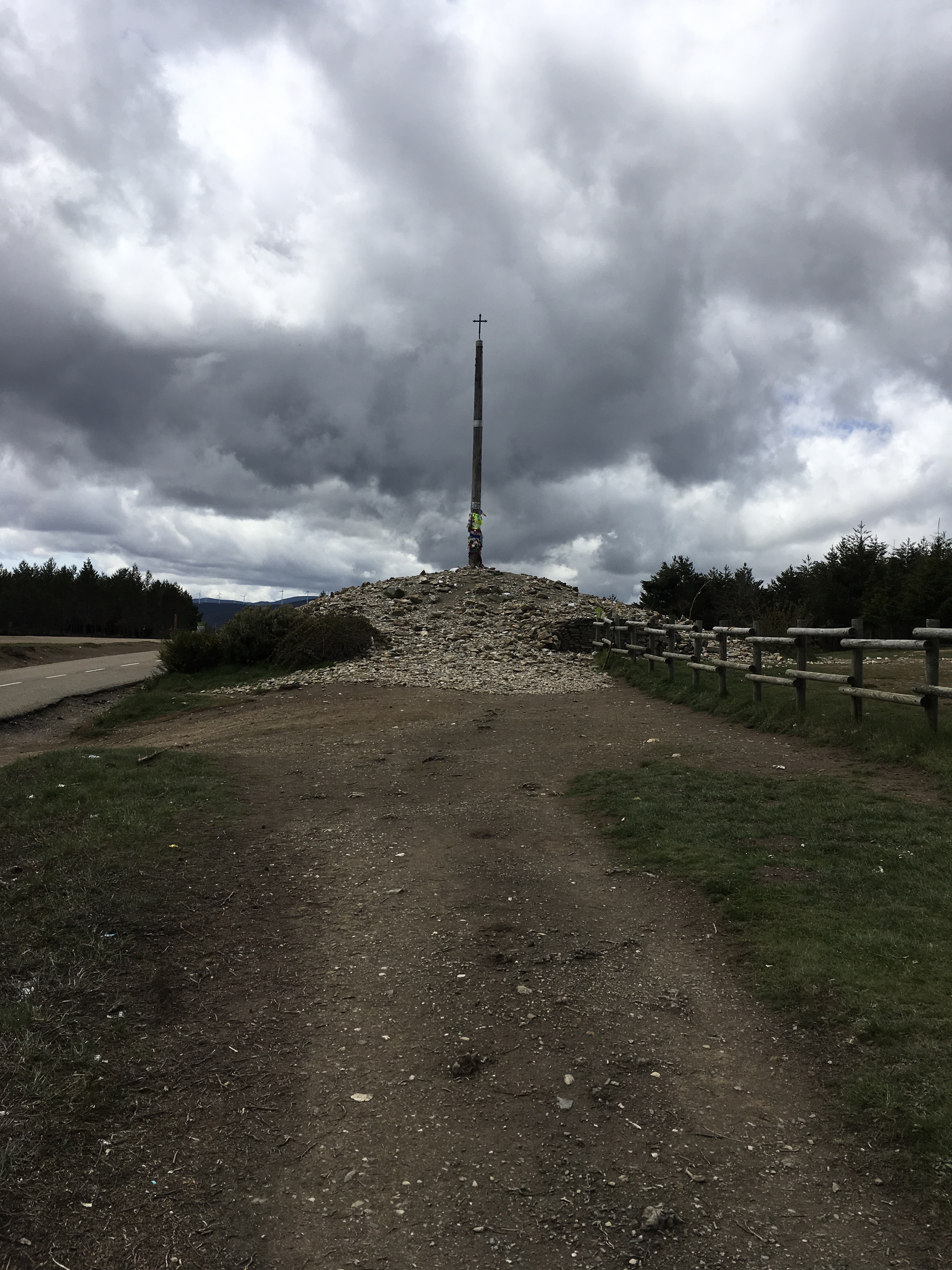 This is the road to Cruz de Ferro (Iron Cross). For centuries, pilgrims have been bringing a stone from home that held their burdens to leave at the cross.  It has created a hill around the cross that continues to grow.