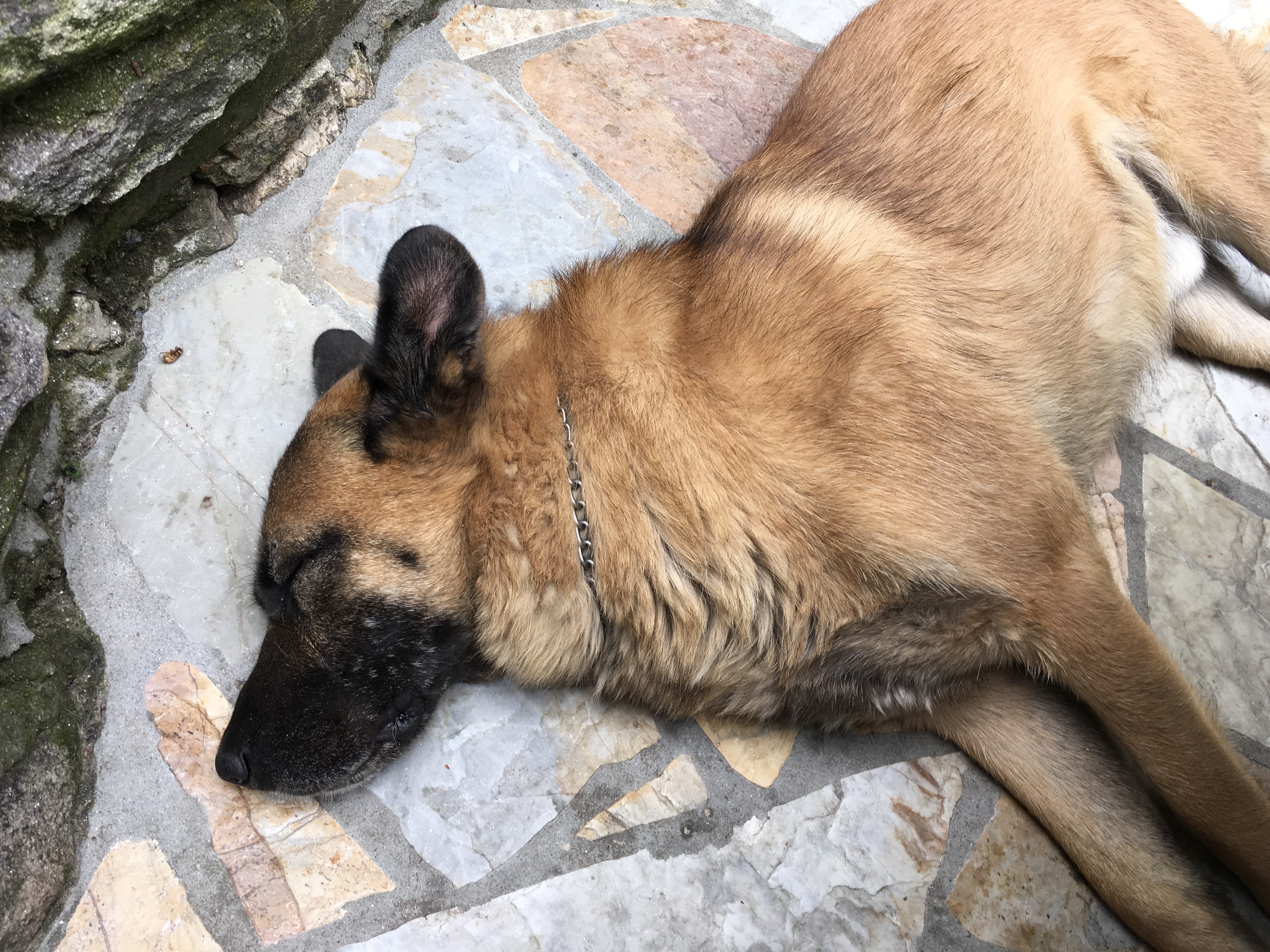 Dog is not dead … he’s just hot and decided to lay down in the street. Cars drive around him.