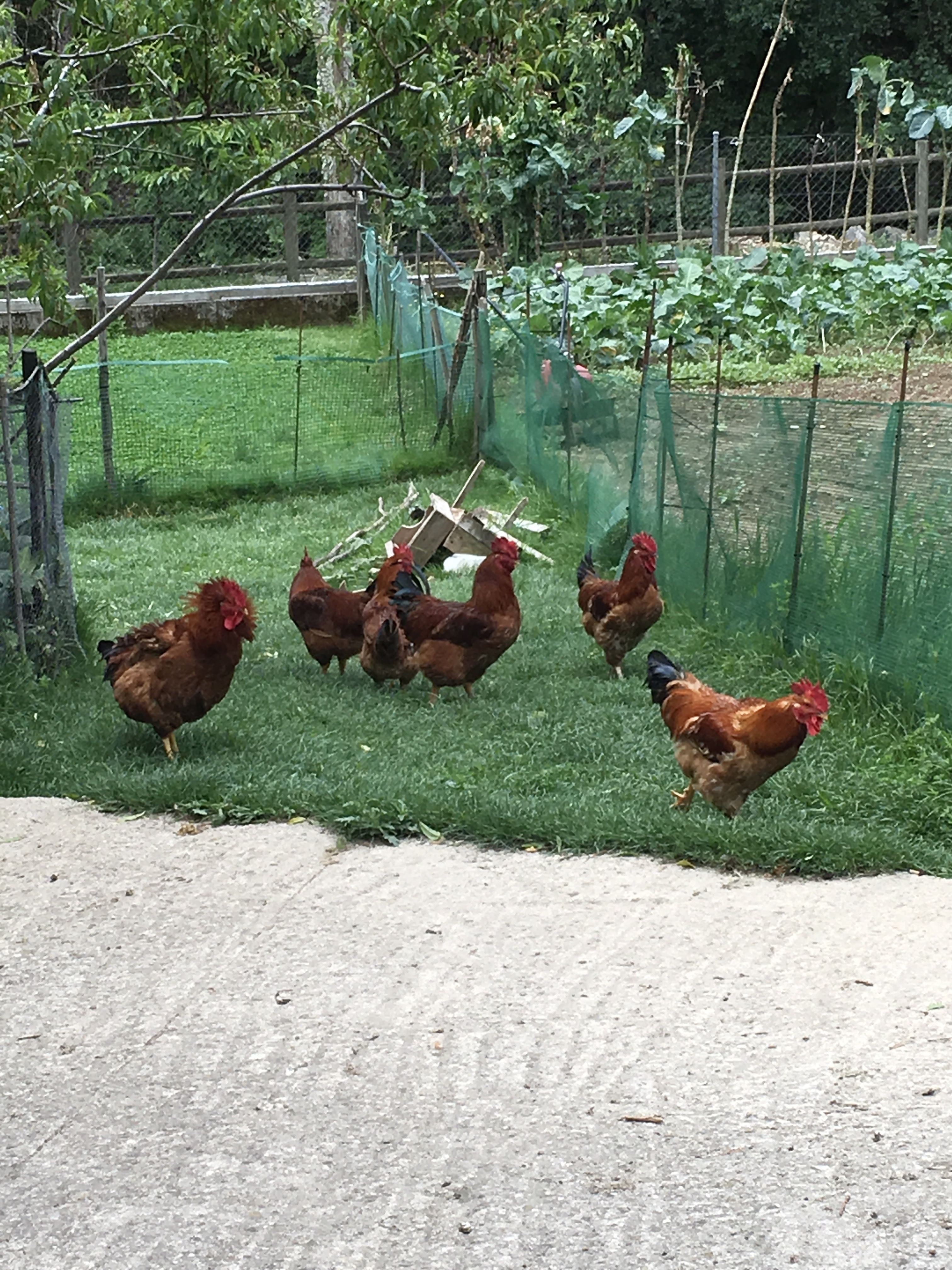 Lots of chickens and roosters crowing.