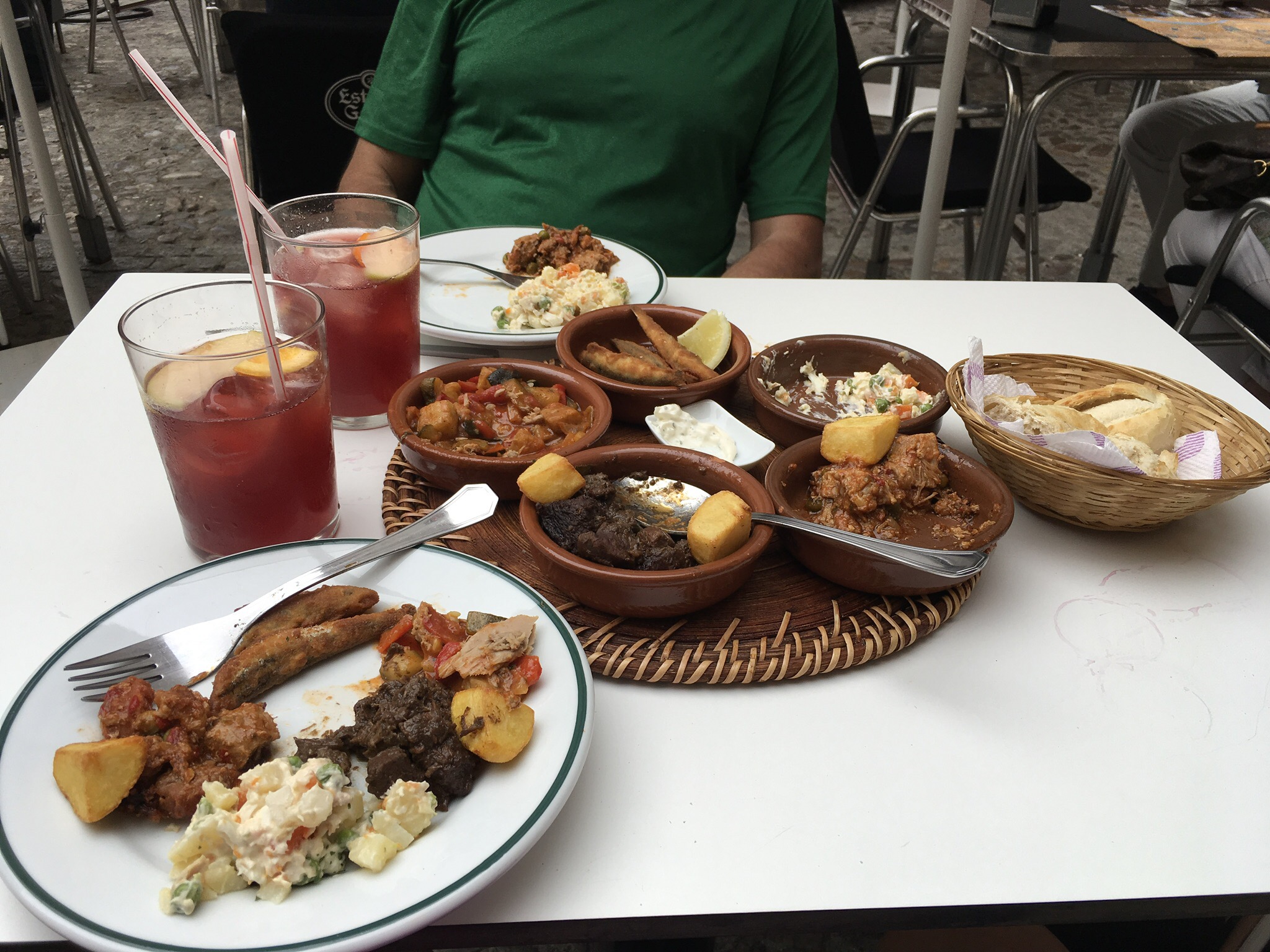 Special of the Day — Tapas for 2: Pisto Manchego which is a bell pepper stew sprinkled with Manchego cheese; Ensaladilla Rusa which is similar to potato salad; Estafado de Venao which is a venison stew; Caracamusas Toledanas is a Toledo specialty made from lean pork with seasoned vegetables, peas and tomato sauce and the last tapa is Boquerones Fritos con salsa tartara which is fried anchovies with a tartara sauce … served with refreshing glasses of Sangria.