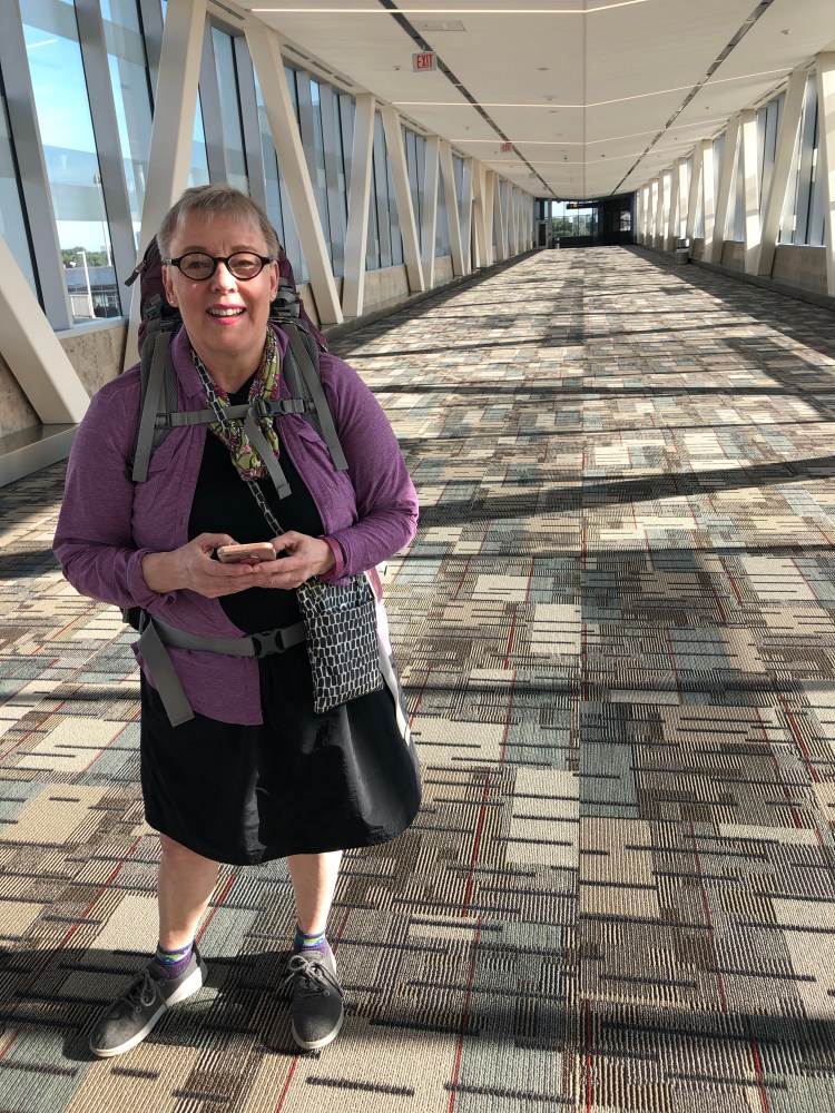 We dropped my backpack at the Delta curbside. David drove us to the front door of the Intercontinental where we said goodbye. We took the elevator to floor 3 and were delighted to see the TSA people and absolutely nobody around. I was giddy with joy. It took minutes to get through security and minutes to walk the skyway to the concourse. The only downside is that this TSA check-in is only open from 5-10 am … and also that we now have lots of time to kill.