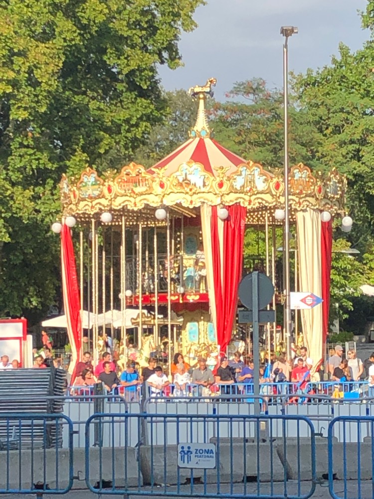 The traffic circle near Atocha station was cordoned off, there were lots of police and many people waiting to see something. We were a little relieved it wasn’t a protest which we knew because we saw a two story carousel and lots of pop-up tents which made us think it was some kind of carnival.