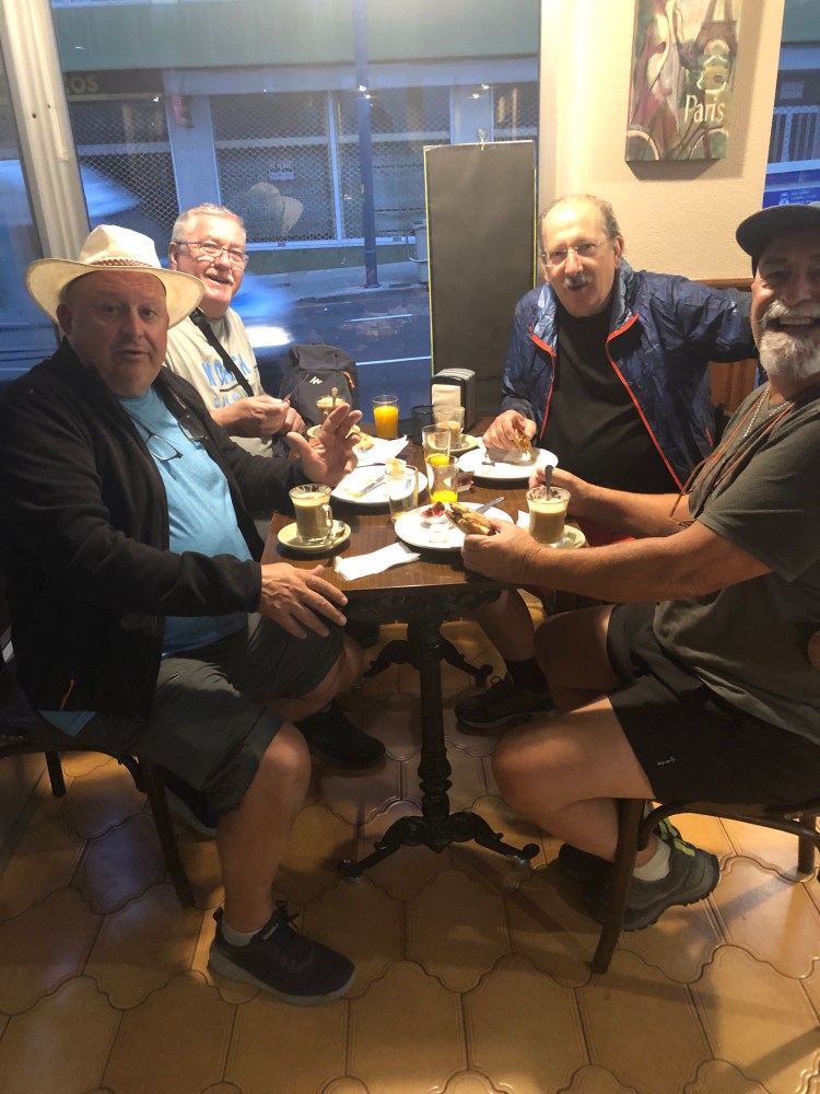 It wasn’t even daylight when we left the room at about 7:40 am. Since the little cafe under our room didn’t open until 8:00 we sat down on the steps and waited. Eventually a group of four men showed up and were also expecting the cafe to be open. One of them asked us “Ocho? Ocho?” We nodded and we all waited. They spoke Spanish and were from the Isle of Majorca (in the Mediterranean) which is located just off the east coast of Spain.