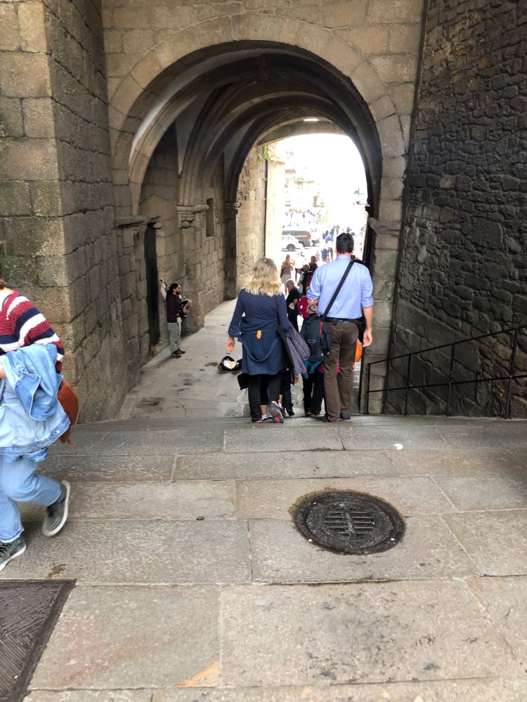 This is the bagpipe tunnel that leads into Cathedral square. Man on the left in photo is playing the bagpipes. The Frances and Ingles camino meet before the tunnel.