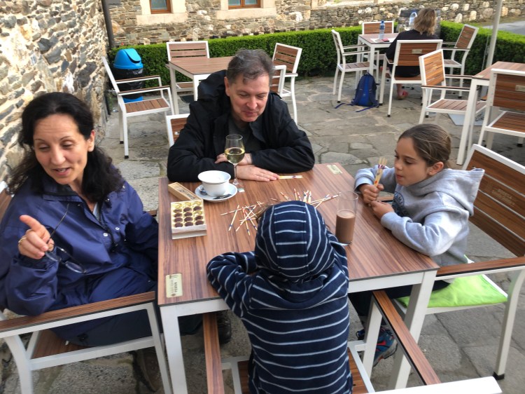 This delightful family is from Spain and stayed at the albuergue. They are walking the Camino. They do about six miles a day which is impressive for such young (well behaved) children. They started in Sarria which is 100K from Santiago — a total of about 62 miles.