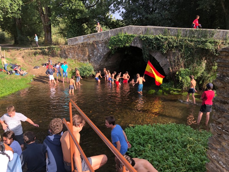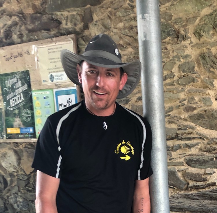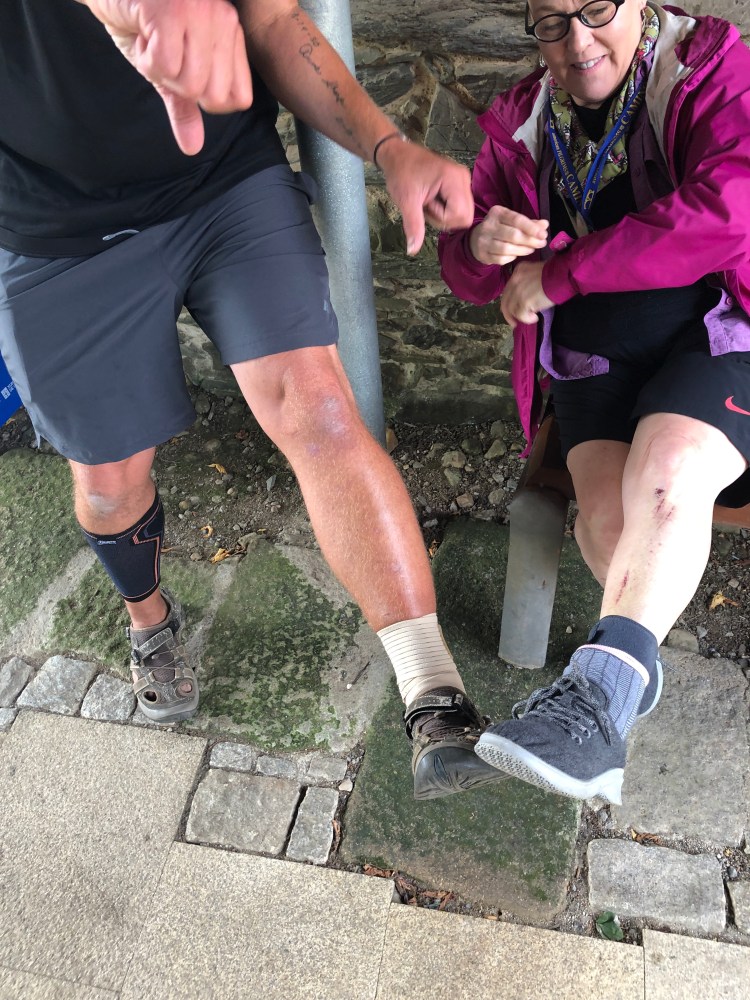 Joseph is tough — he broke his ankle while on the camino. It was a pot hole in Zuberi at the beginning that did him in. He rested but never stopped walking. He is two days away from Santiago. In the photo above, he and Terry compare ankle injuries and commiserated on Terry’s Therapy bench. Joseph also cut his finger to the bone. Didn’t get stitches. A nurse walking the camino wrapped it for him.