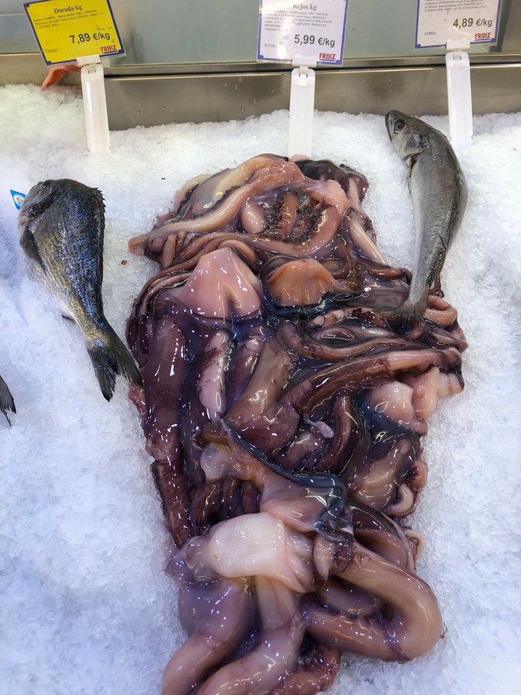 We wanted to get a little more exotic with this week’s menu. But not as exotic as the seafood shown above. This week we opted for shrimp, swine hocks, sausage, pasta, rice and the usual eggs, bacon, cheese, etc. I wanted to find sauerkraut to go with the swine hocks but that word does not translate. The best I could do was to find a small cabbage.