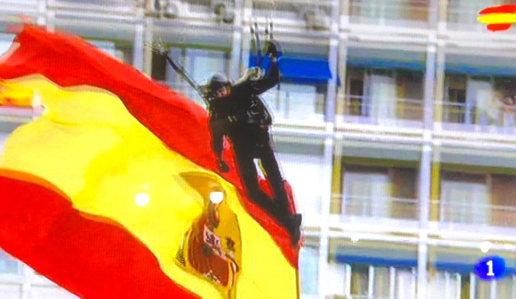 The opening highlight of the ceremony was when a paratrooper leaped from a military plane. He parachuted down with a giant spanish flag. It was a beautiful sight … the paratrooper flowing through the air with the Spanish flag until …. splat — he collided with a street lamp. The crowd gasped as did everyone at Meson Rural.