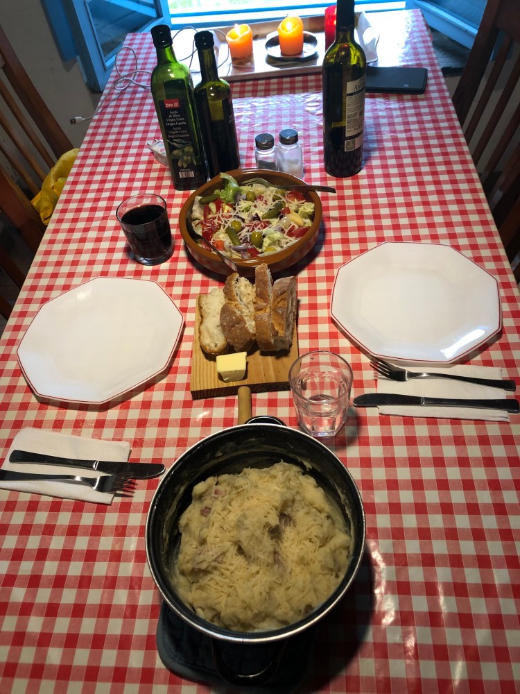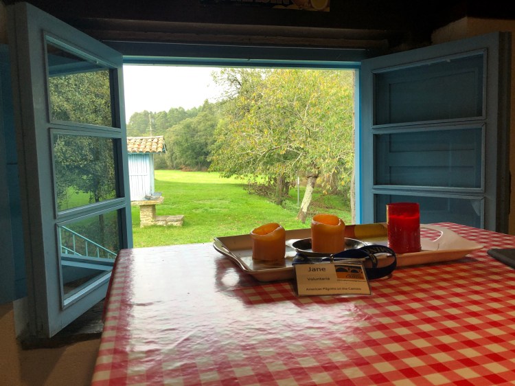 It was a slow Saturday. Less than 30 pilgrims staying at the Albuergue. We retreated to the cottage early. Tonight’s gourmet dinner was a concoction of mashed potatoes, sausage and cheese.