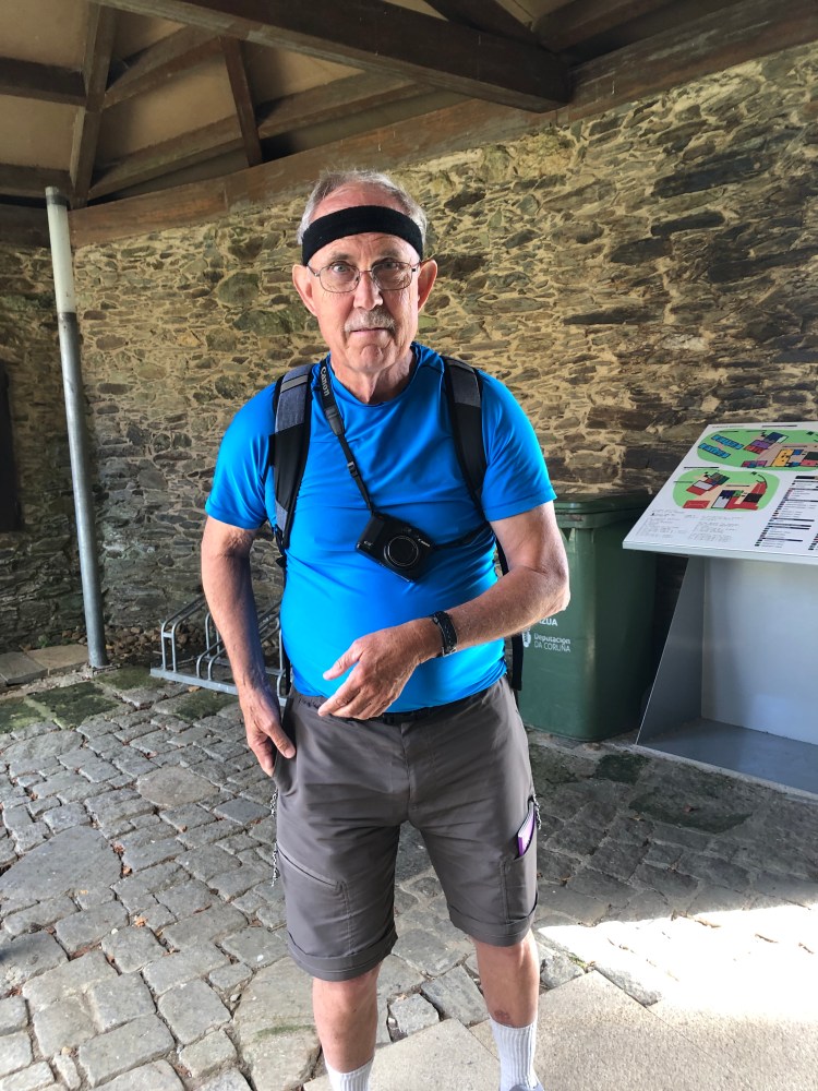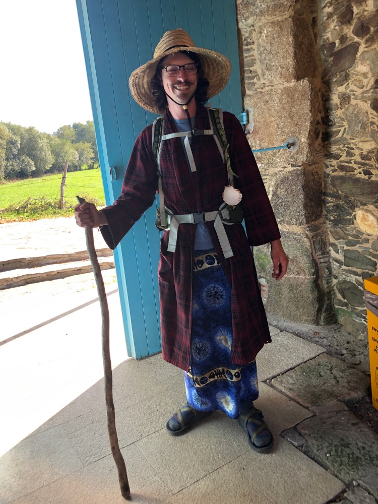 Bathrobe Bob from San Diego stopped by on his way to Arzua. He is wearing a bathrobe with a sarong underneath.