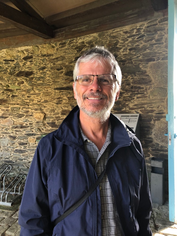 Pilgrim of the Day: Girard from Montreal — “Call me Jerry,” he says with a thick French accent. This guy is a gem! Very fun to be around. After telling him there was no Mercado in Ribadiso he was going to walk 1-1/2 miles uphill to get some bread in Arzua. We offered to give him some of our bread. It was day old — to make it look better I put a ribbon on the bag. He was napping in the dorm when I dropped it off so I gently left it on his stomach.
