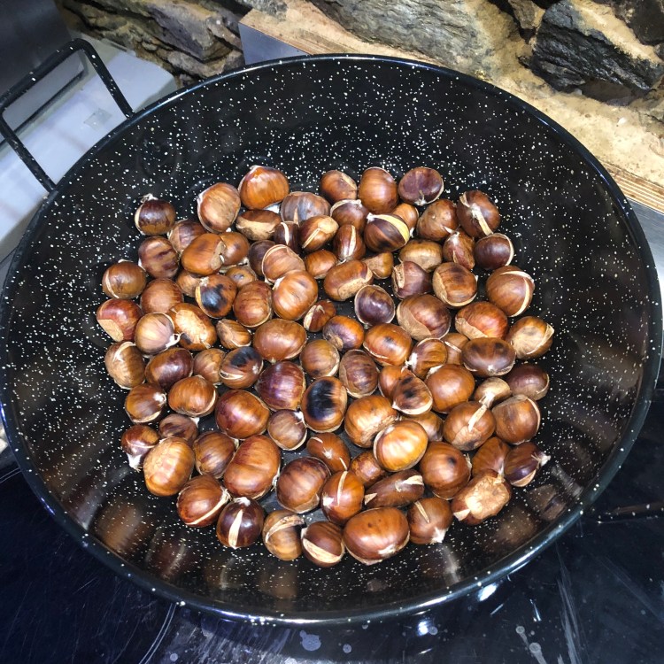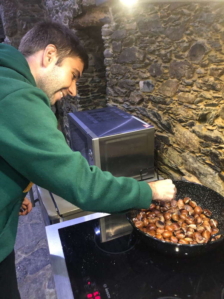 Jesus from Madrid roasting chestnuts in the Pilgrims’ kitchen. He probably gathered them on his way. As we discovered when walking Camino Ingles, Chestnuts are plentiful in Galicia.