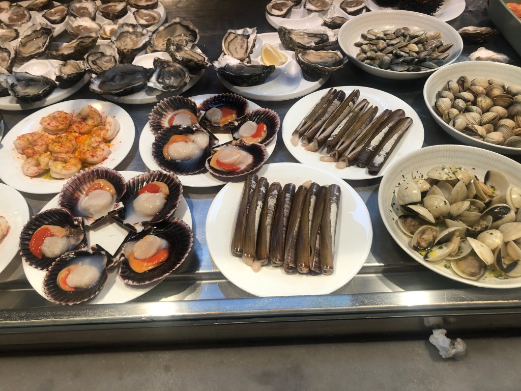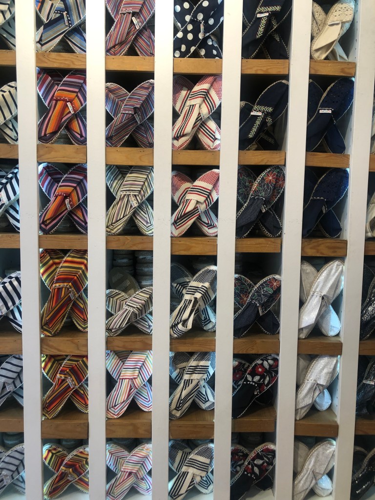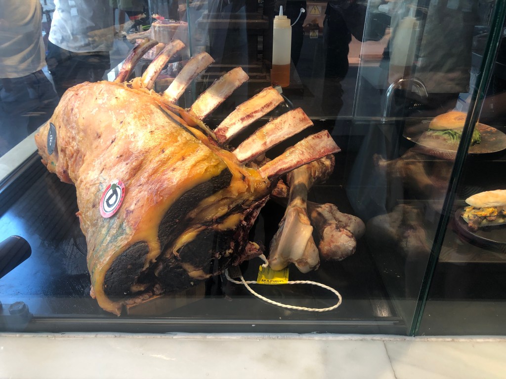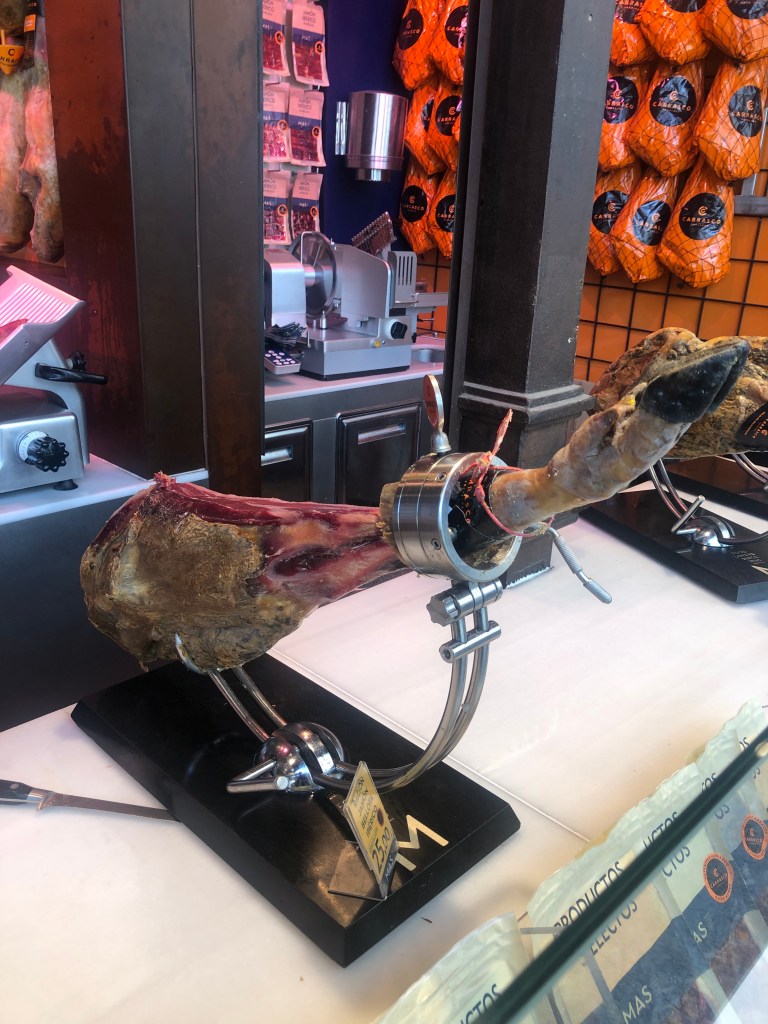 This is a favorite breakfast spot. Glad to see that most of the shops and restaurants survived the pandemic and are open for business again.“If you’re not drinking wine, it must be breakfast,” Chiquita restaurant. Jet lag makes it hard to decide what meal you should be eating. This hearty plateful covered all the bases. Sounds of a street musician playing glasses accompanied breakfast this morning. How do people learn to do this kind of stuff?A wall full of espadrills beckoned us to a nearby shop. Interesting display.Time for a stroll over to plaza Mayor Mercado de San Miguel is a gourmet market featuring the culinary talent of a number of internationally renowned chefs.Lots of seafood …Octopus appetizers Yum!I think this is a brontosaurus.Swordfish coming out of the ice? Whatever it is, it has no teeth but that sword-like nose could do some damage. Sign next to is says … “Do Not Touch — They Bite Sometimes.”The top shelf features Crabby Patty … I’ve seen them on Sponge Bob.Ibérico Belotta Ham is a Spain specialty that sells for $140 per pound. Why?? See below.