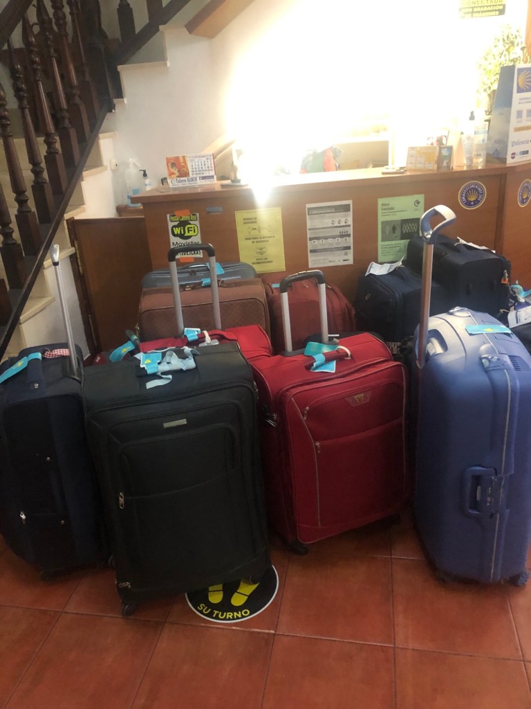 In the reception area before entering the restaurant, I saw something unusual — several suitcases waiting to be transported to their next location. What’s unusual is that some people who are walking the Camino are opting to bring a suitcase instead of a backpack. There are courier services on the Camino that will transport backpacks, suitcases or other parcels to your next Camino stop. It costs about $5 a day and for many who don’t want to carry a backpack, it’s a great option.