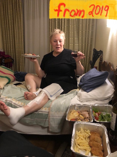 If you followed the ‘Jane in Spain’ blog in 2019, you will know this story. We were two days from finishing the Camino Ingles. We were staying overnight in the town of Ordes and we were just out for a stroll. The sidewalks were torn up with a construction project. Theresa was on the edge of a sidewalk taking a photo and the sidewalk crumbled under her feet. She fell, hitting her shins on the concrete and tearing ligaments in her ankle.
