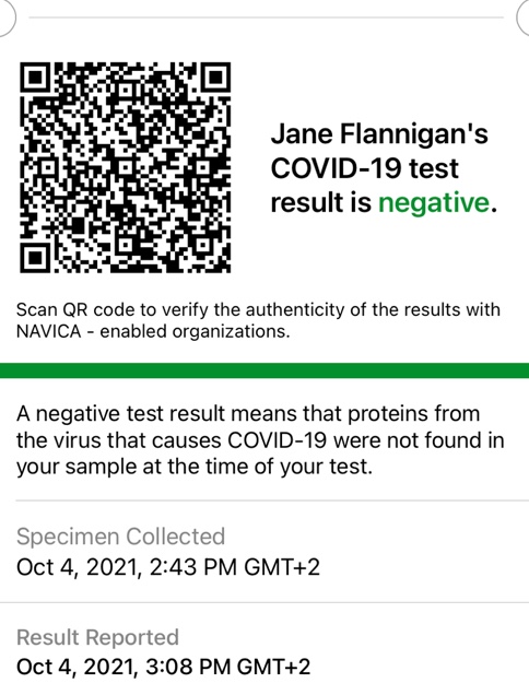 Next, there is a 15 minute wait while the test specimen is developed. You don’t have to sit there, you can move around but the test specimen has to stay in the presence of the technician. After the 15 minutes, the technician tells you the results and will email a QR code with the results.