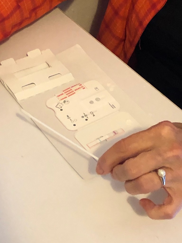 Then the tech walks you through the process of setting up the test. In the presence of the tech, you swab your nose and insert the swab into the test slot.