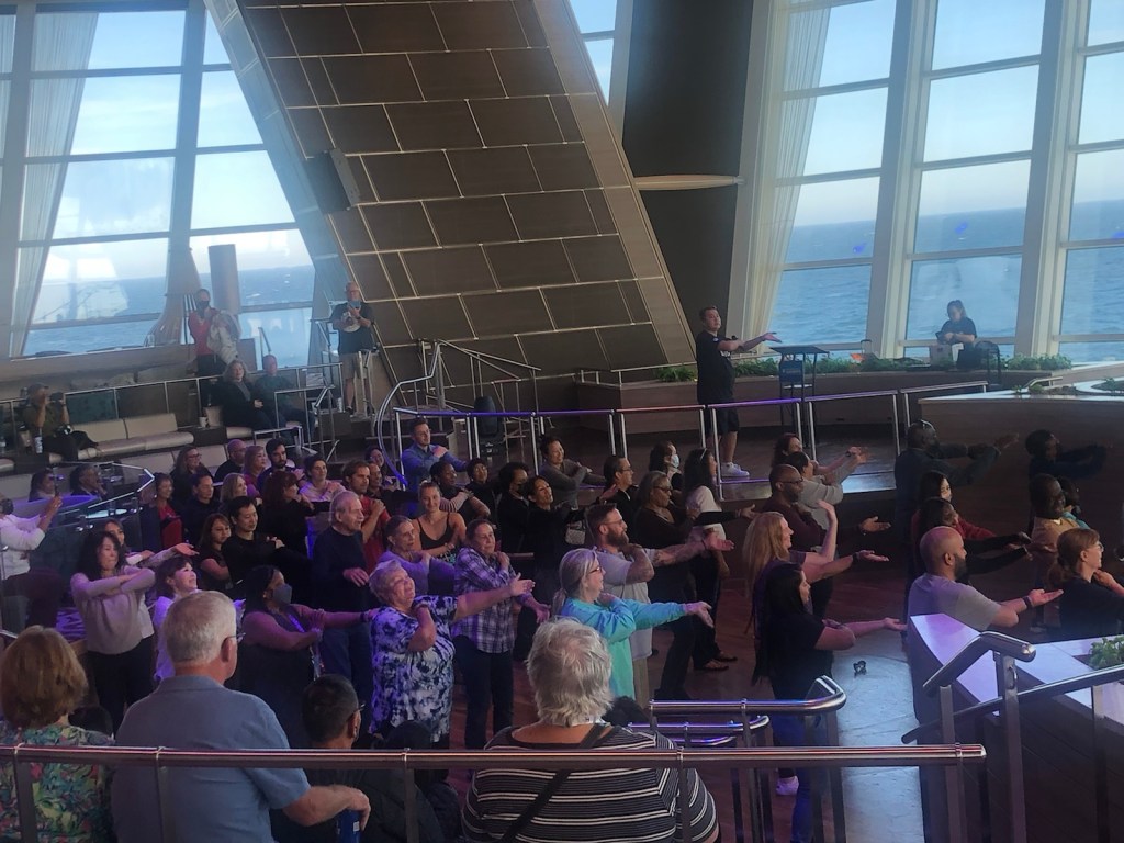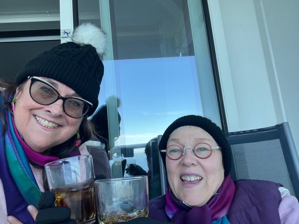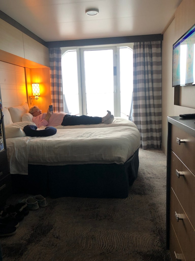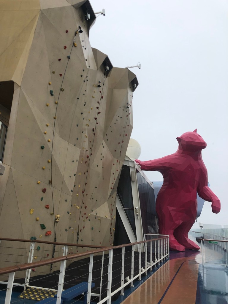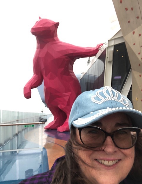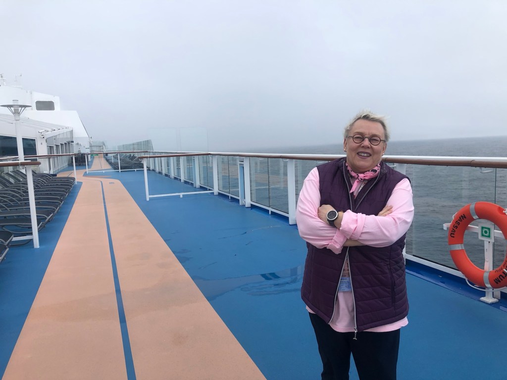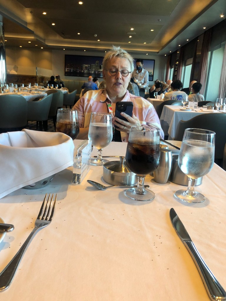 Today we start the journey back to Seattle with a brief stop in Victoria tomorrow night. Plenty of activities on board during the ‘At Sea’ days. It’s not raining today but there are gale force winds rocking the boat. The closed pools were sloshing and outdoor activities were cancelled. We took a visit to the top deck. Notice Theresa and I are the only ones on the top deck??