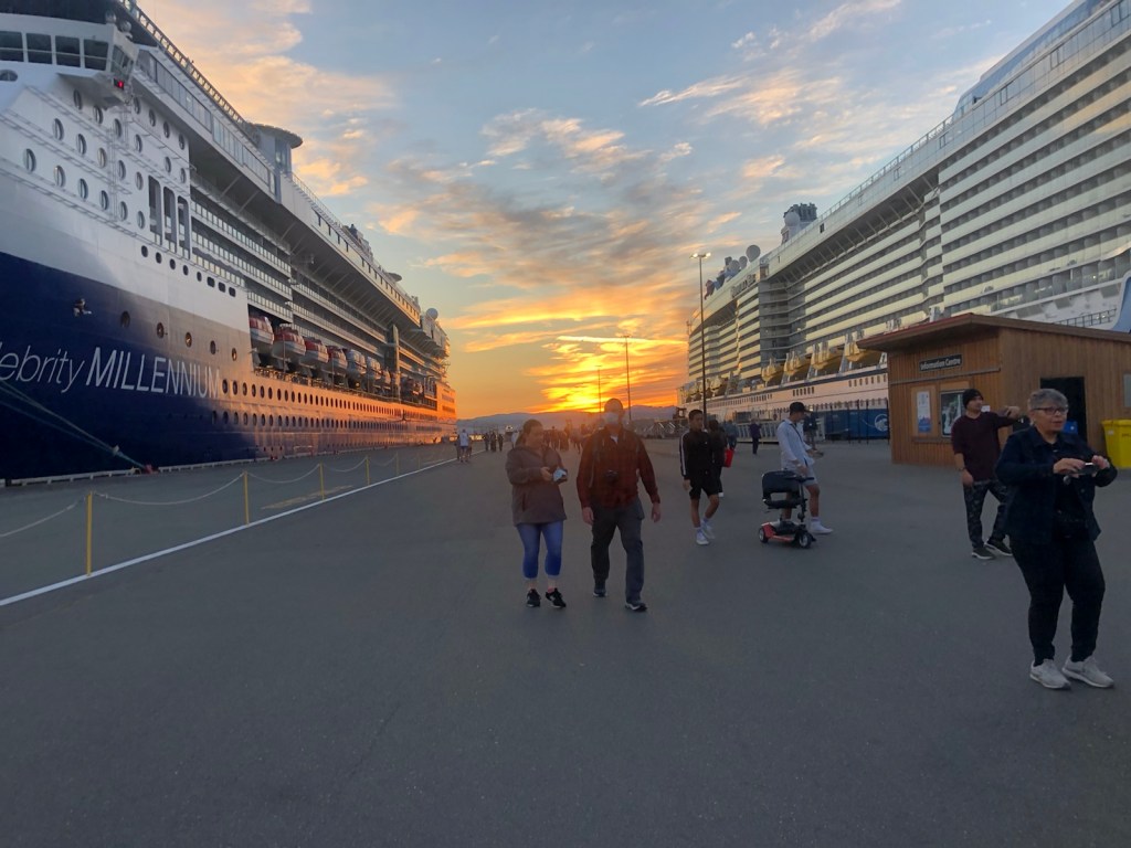 Our ship pulled into Victoria. There was an empty cruise ship next to us. The guests were probably out seeing Victoria. The ship’s big outdoor screen was broadcasting the Packer game which Terry was watching from our balcony.