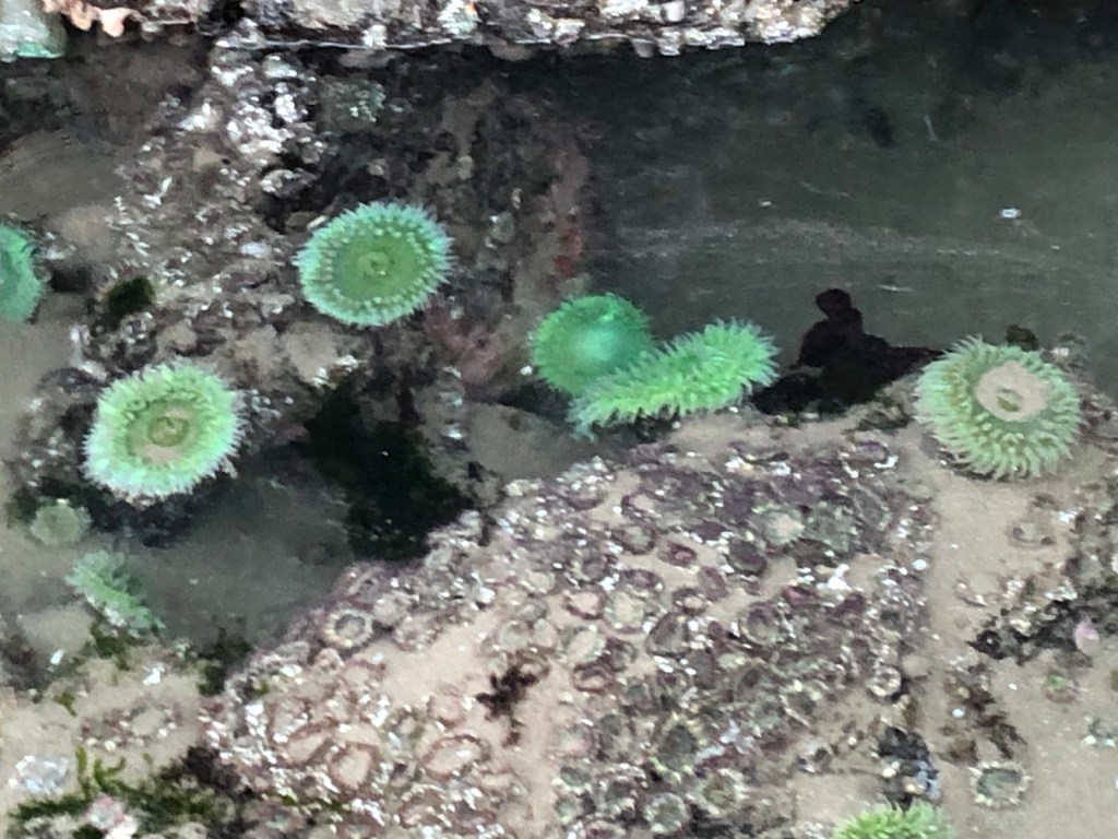 Beautiful green sea anemones were found in shallow tidal pools. We also saw a variety of crabs of all sizes.