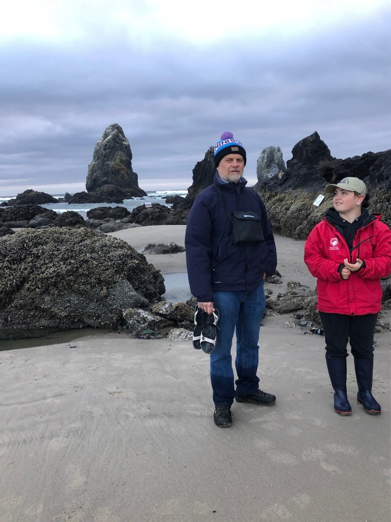 According to the Haystack Rock Awareness Program volunteer, the lava flowed along the old Columbia River drainage system to the ocean and intruded into the soft marine sediments. Eventually with sea level changes and erosion, these bizarre formations can be seen all along the Oregon coast.