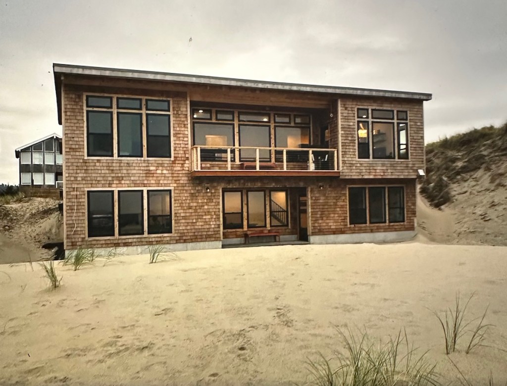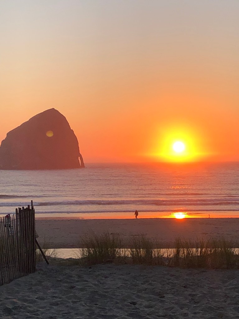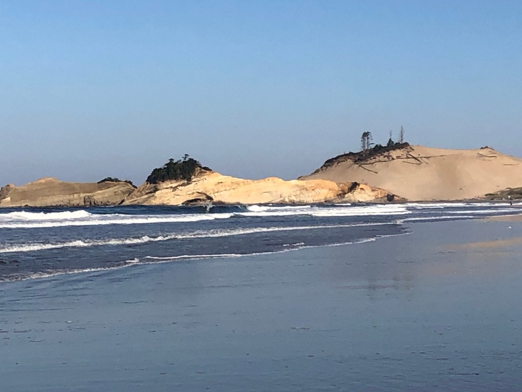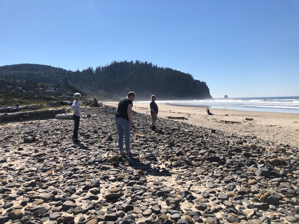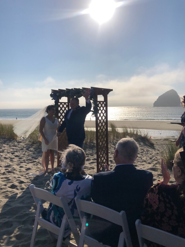 Not sure what this tree is but it is amazing to look at with its perfect symmetry and wavy branches.Here’s our rental house … with enough beds for over a dozen guests.A scenic view from our new digs. Pacific City has a haystack rock like Cannon Beach but it’s out farther and not reachable in low tide. Lots of surfers.Early sunset after a long day. Weather is looking better for beach wedding tomorrow.The house features a gourmet kitchen and my nephew James is right at home with it. He and my sister-in-law Ellen whip up breakfast for 14.Friday brings a beautiful blue sky sunny day in the low 80s. Perfect. The wedding is the focus of today and everyone is relieved that the weather is cooperating.The Minnesota contingency is on time and ready to celebrate. (Richard & Lisa missing from photo. )Guests begin to arrive for the wedding.An unforgettable ceremony …… followed by a beautiful indoor reception. A stunning sunset sneaks by as the reception rolls on. The colors of the sunset changed every few minutes. The evening ended with sparklers on the beach. Chandler & Kelly pulled off the perfect wedding.Saturday … we have a whole day open and four rental cars. Some went dune climbing, some went to Lincoln City looking for fresh seafood for dinner and some took off for wine country. Richard, Lisa, Ellen and I set out for Cape Meares for some stunning ocean views.Today’s dinner plan is for a seafood extravaganza.The dunes may look easy but provide a challenging climb and workout.So much fun to cruise the west coast with good friends Richard & Lisa. It was a beautiful drive to Cape Meares with lots of farm land and interesting terrain. A stunning wayside view in Tillamook county heading for Cape Meares.We took a break at a stone covered beach. Unfortunately, the road to the lighthouse was closed.No lighthouse … reroute. Now we’re heading for Willamette Valley which means a drive through the coast range heading toward Portland. More interesting forests with moss covered trees which at night could easily be mistaken for Sasquatch … that must be how those stories start.We arrive at Apolloni Vineyards which produces Oregon and Italian wines. The Valley is Oregon’s oldest wine region and has two-thirds of the state’s wineries and vineyards. Apolloni is a family run vineyard. Alfredo, (second-generation) shares his passion for the vineyard and the wines we were sampling.
