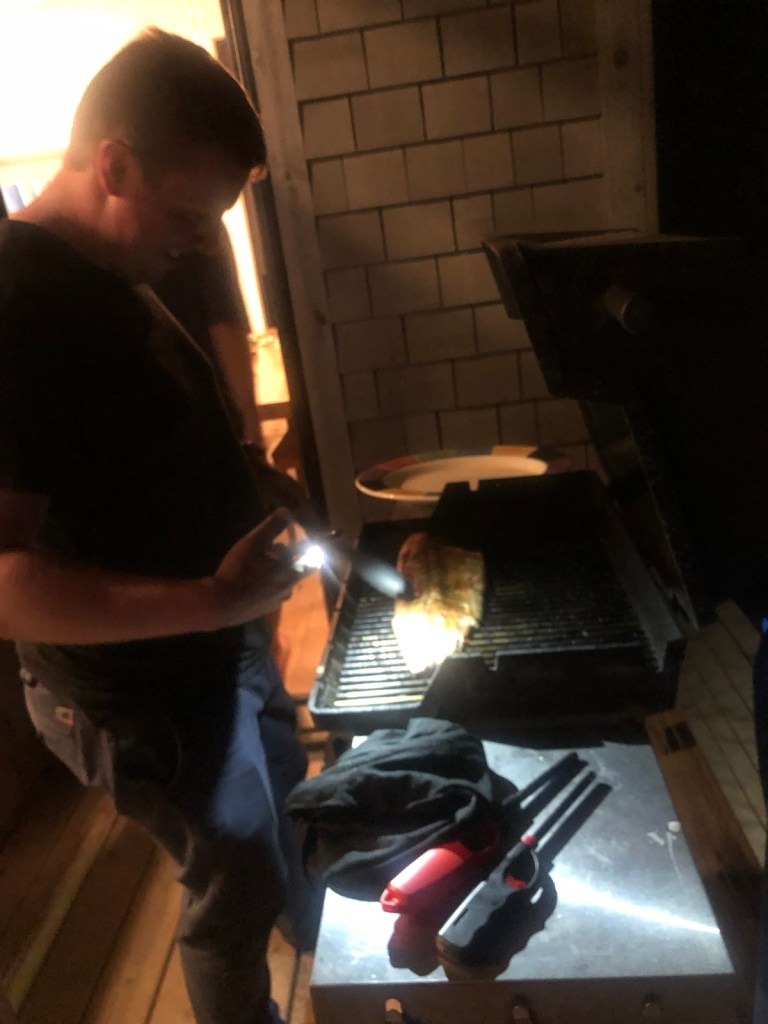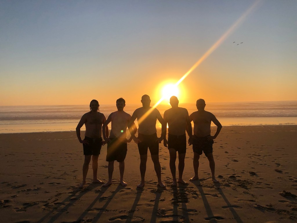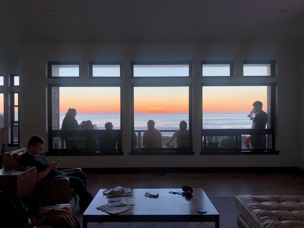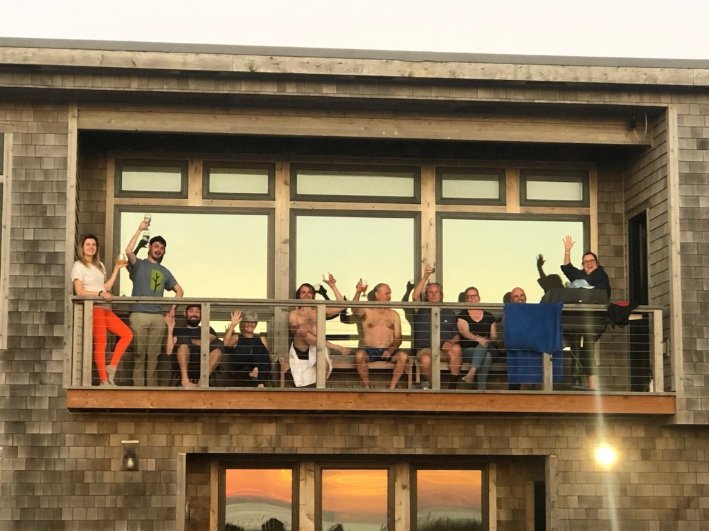 Bubba and Ellen kick back after a long day of exploring.Tonight’s chefs, cousins James, Kyle and Owen doing seafood & oyster prep for dinner. Happy hour charcuterie.Everybody on the deck … getting ready for the sunset.A beautiful view from the cavernous living room.A final sunset worthy of an awesome trip. Someone had a great idea — let’s go swimming!There they go … water was extremely cold so the swim didn’t last long. A lot of hootin’ and hollerin’ took place. And they survived with another great memory.Back to dinner prep. A seafood bisque in the works.James workin’ the grill by cell phone light.A beautiful feast. Food, family, friends … the best dinner ever!