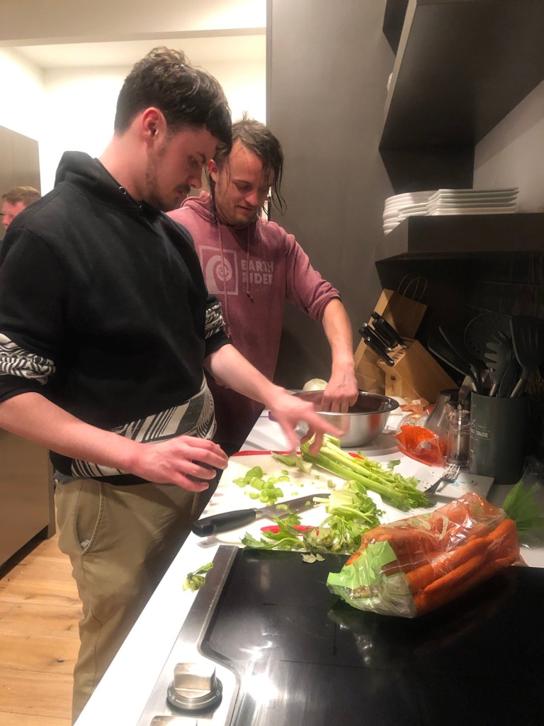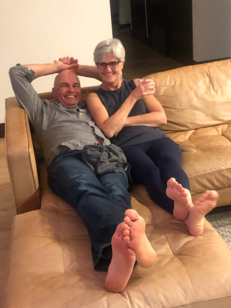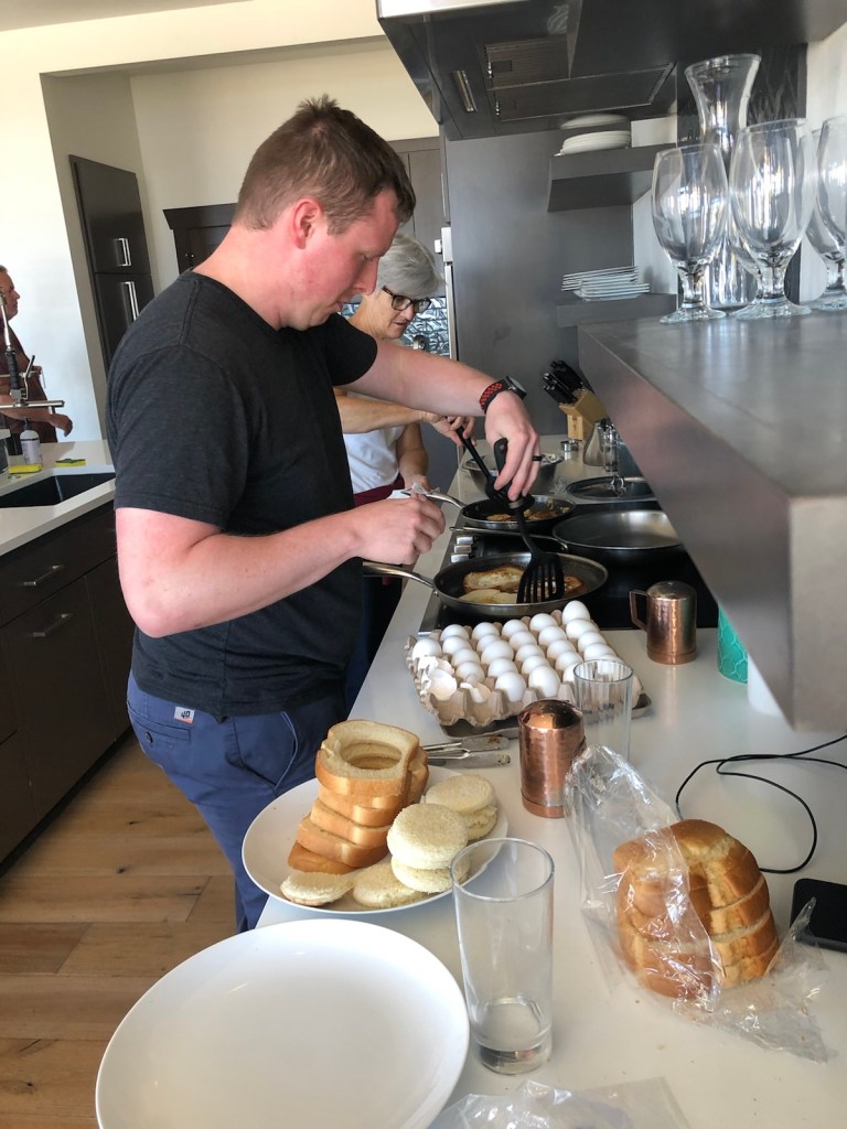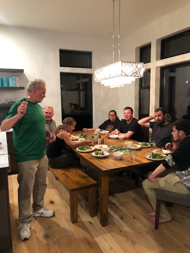 Bubba and Ellen kick back after a long day of exploring.Tonight’s chefs, cousins James, Kyle and Owen doing seafood & oyster prep for dinner. Happy hour charcuterie.Everybody on the deck … getting ready for the sunset.A beautiful view from the cavernous living room.A final sunset worthy of an awesome trip. Someone had a great idea — let’s go swimming!There they go … water was extremely cold so the swim didn’t last long. A lot of hootin’ and hollerin’ took place. And they survived with another great memory.Back to dinner prep. A seafood bisque in the works.James workin’ the grill by cell phone light.A beautiful feast. Food, family, friends … the best dinner ever!