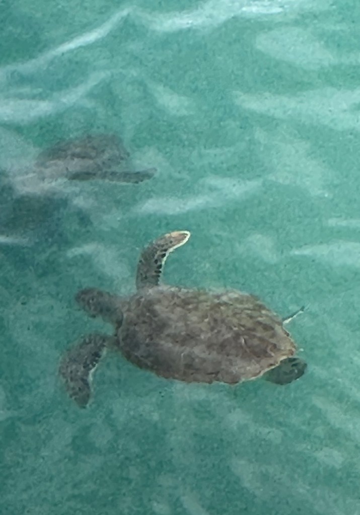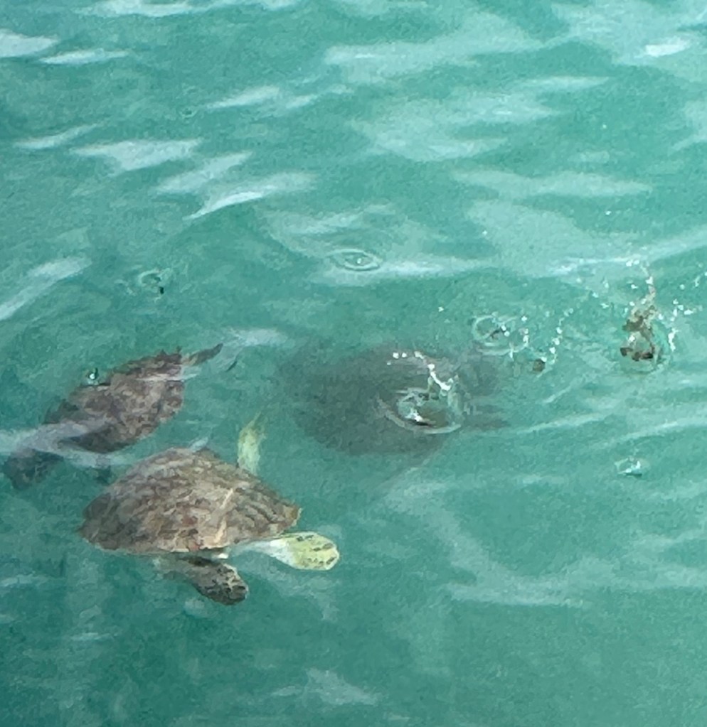 The Sea Turtles appear from 11:00 – 4:00 daily and so do the cruise ship excursions. The sea turtles come for the Fishermen’s scraps that get tossed over.