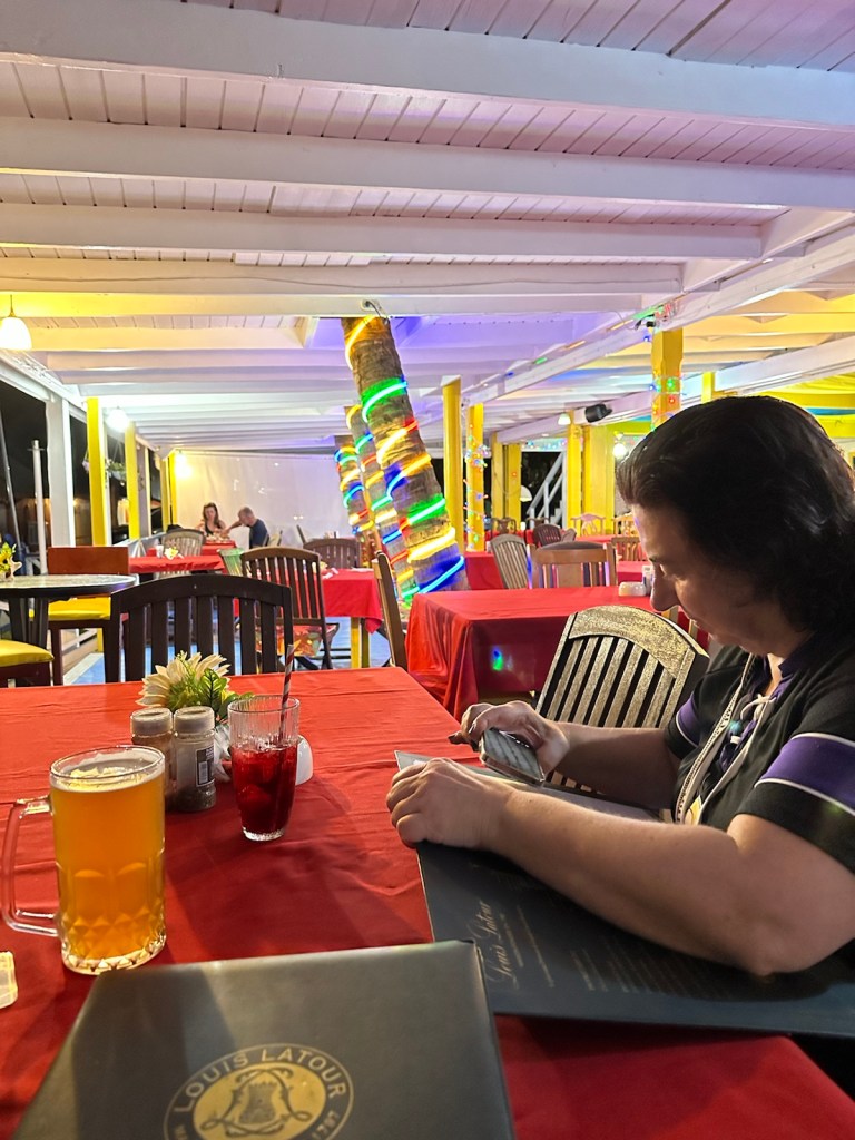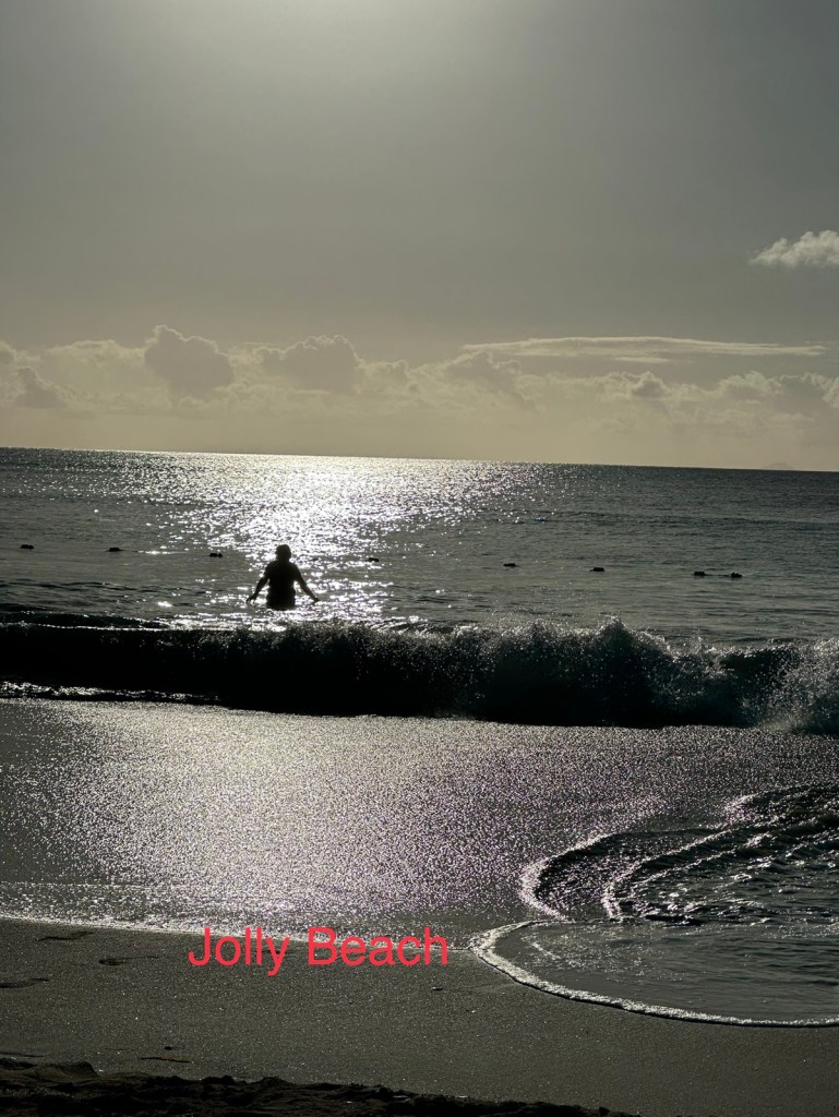 Next stop is Jolly Beach on the southwest coast. They wanted $25 (US) to sit on two beach chairs. We only had two $20 bills which no one will take because they were slightly torn. We told the woman we’d just sit on the sand. She then told us to go ahead and sit in the chairs (free). Maybe we should carry the torn bills with us to all the beaches.