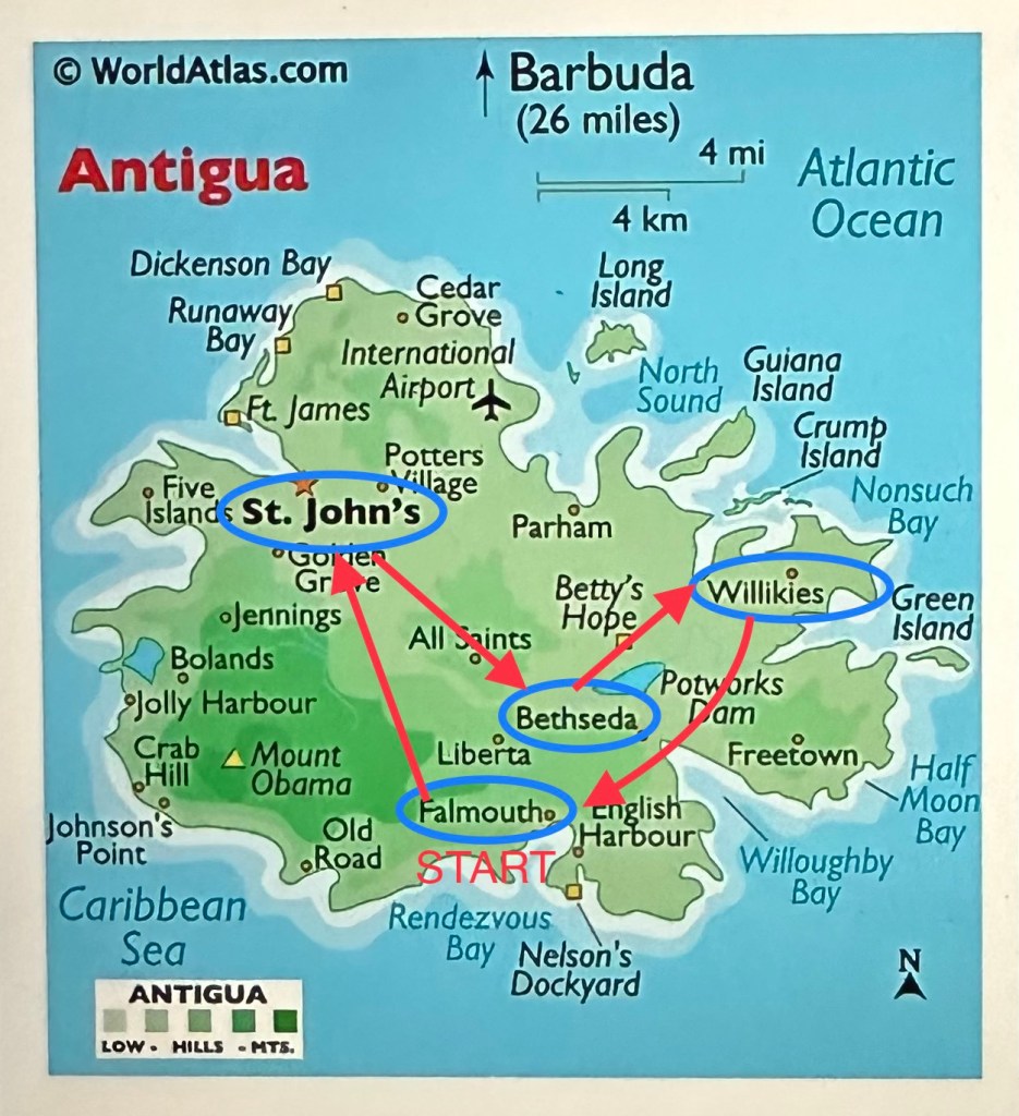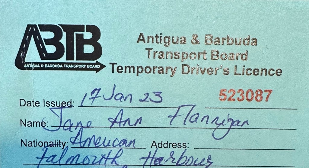 Today’s Driving Dilemma: Everything was going great until I came upon a row of parked cars. I followed a motorcycle around them and to my horror after passing about 10 cars, I discovered that they were not parked — the drivers were on the right side and they were all waiting for a traffic light. Embarrassing. We waved and smiled and went slowly. Some kind soul let us pass through the intersection. For the most part, Antiguan drivers are very courteous and will often stop, blink their lights and allow you to cut through their lane to accommodate a turn during backed-up traffic.