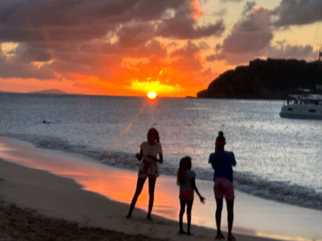 We need to get back to Falmouth Harbour in time for a swim and sunset at Pidgeon Point beach. It’s Saturday evening and this is the first time we’ve seen a crowded beach. There were a lot of locals and kids enjoying the water and sunset.