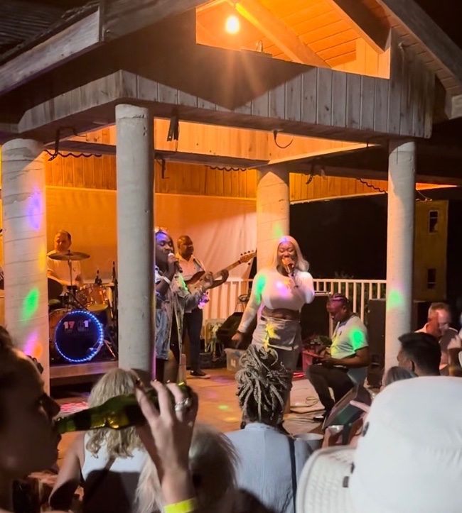 Now it’s hard to maneuver around the crowd. Lines at the bars are ten deep with party-goers ordering trays of rum punch for their tables. There’s even longer lines for food tickets and the buffet where the portions are generous.