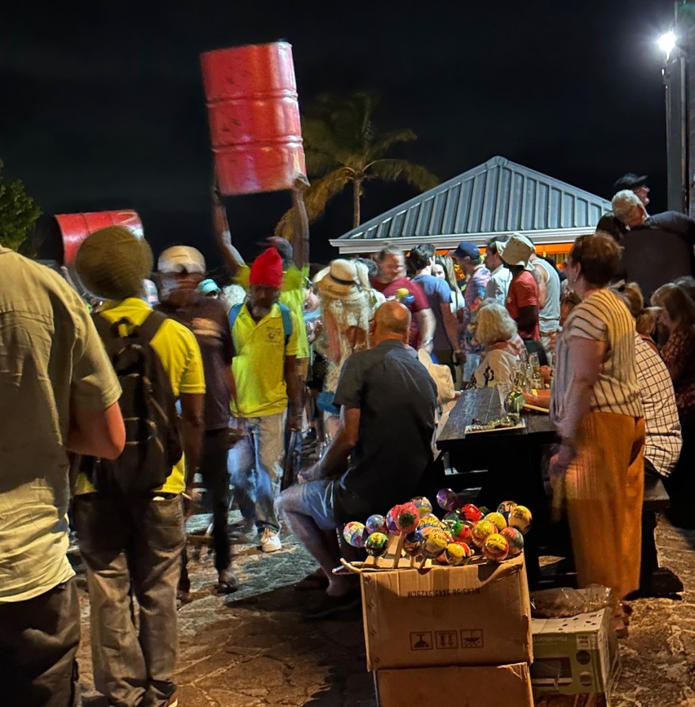 The Halcyon Steel Orchestra wrapped up about an hour after sunset. The next performers had a calypso sound … and the party goes on until the late hours.