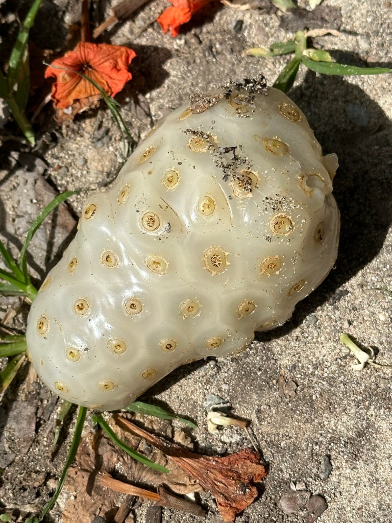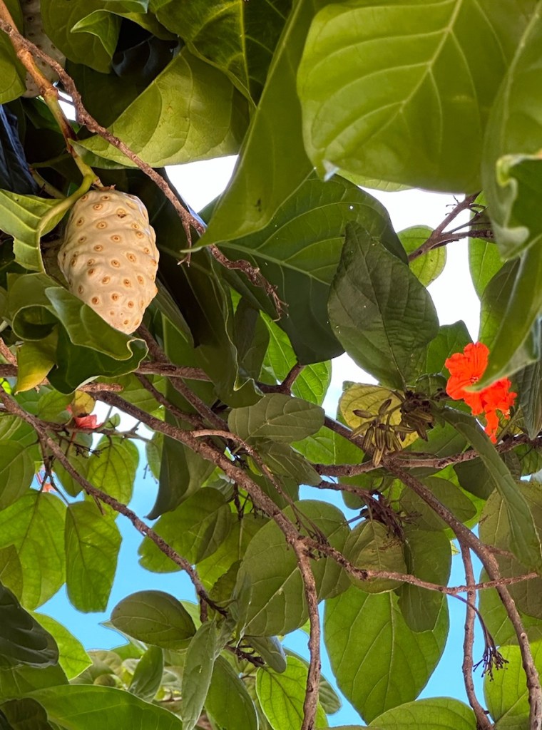 A tree on our path had big white soft squishy-gel like fruit. Peggy looked it up and discovered that one of its names is “vomit fruit”. Glad we didn’t smell or touch it. There are over 100 names for this fruit but the scientific name is Morinda Citrifolia more commonly known as Noni and it is a fruit-bearing tree from the coffee family.