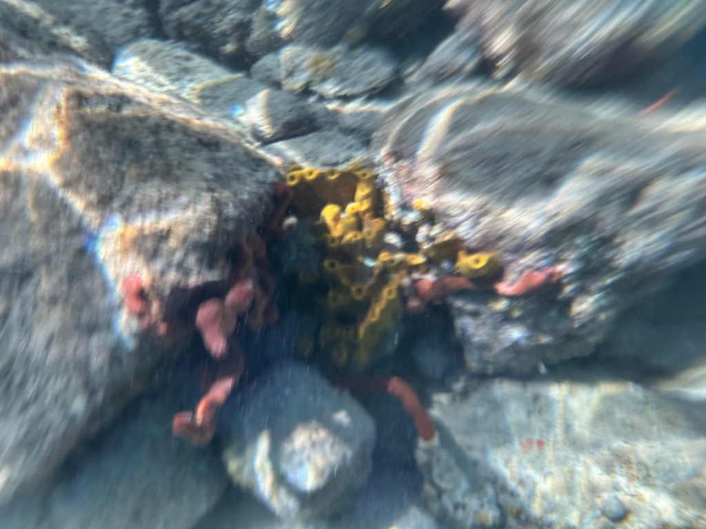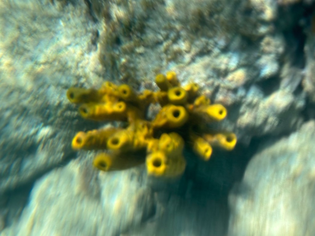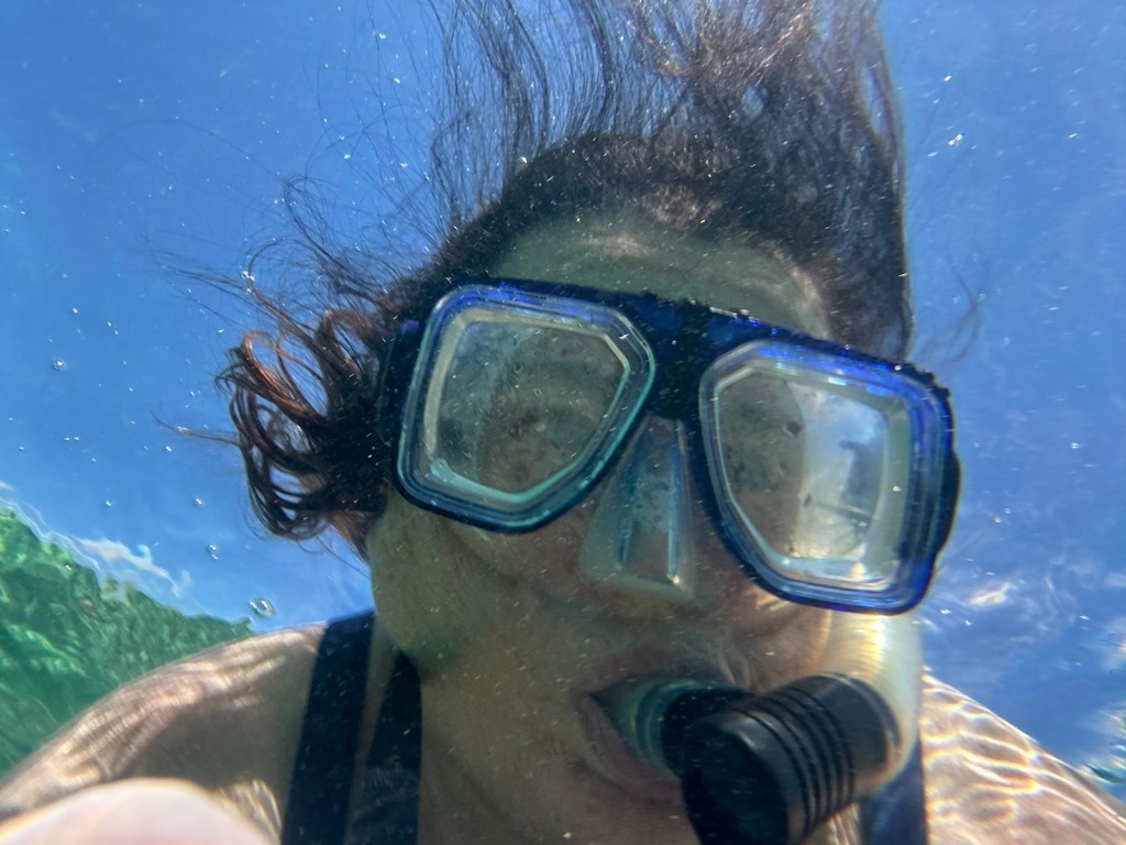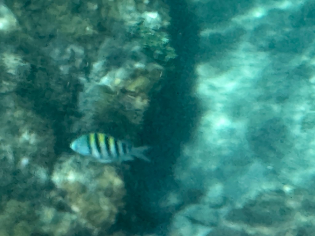 We were much closer to the reef and the snorkeling was pretty good here. This was my first attempt at underwater photography … just using my i-phone in a water proof case. There was a variety of colored fish but they’re hard to photograph — they move fast and I’m still fumbly with cell phone buttons under water in a case.