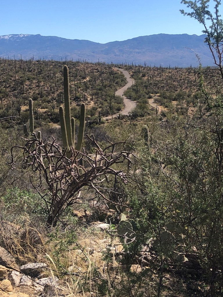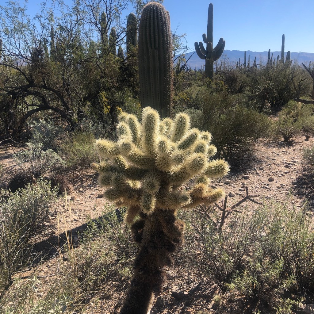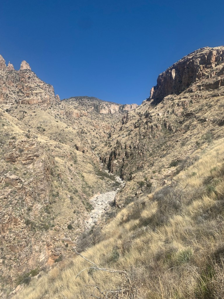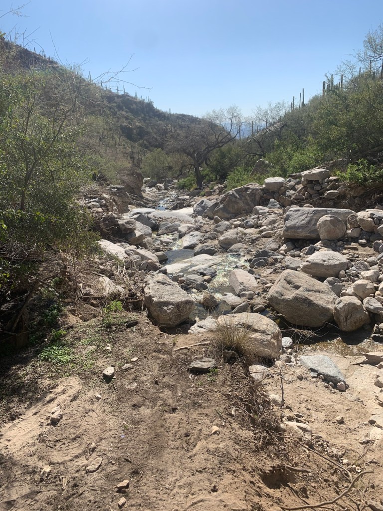 This place has a very relaxing vibe … the warm sunshine, endless diversity of cactus, the rugged hillside and canyons with their dirt trails and a rambling creek. Very peaceful. Cars are allowed only in the parking lot and there is a daily shuttle that goes to various locations in the park which is part of the Coronado National Forest.