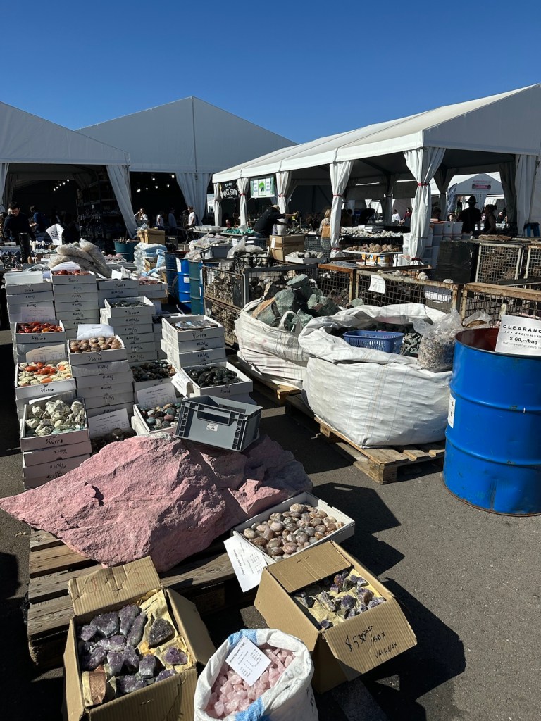 Tucson Gem and Mineral Show: While David climbed FingerRock and John golfed 18 holes, Vicki and I rocked the Gem & Mineral show. Going big, we went to the Kino Sports Complex which resembled a state fair with countless white tents on blacktop reflecting and absorbing the 80 degree heat. It smelled like a carnival with that deep-fried ‘whatever’ smell wafting through the air. We were surprised to find that parking and admission were free but it took us a good half-hour to walk from the car to the entrance.
