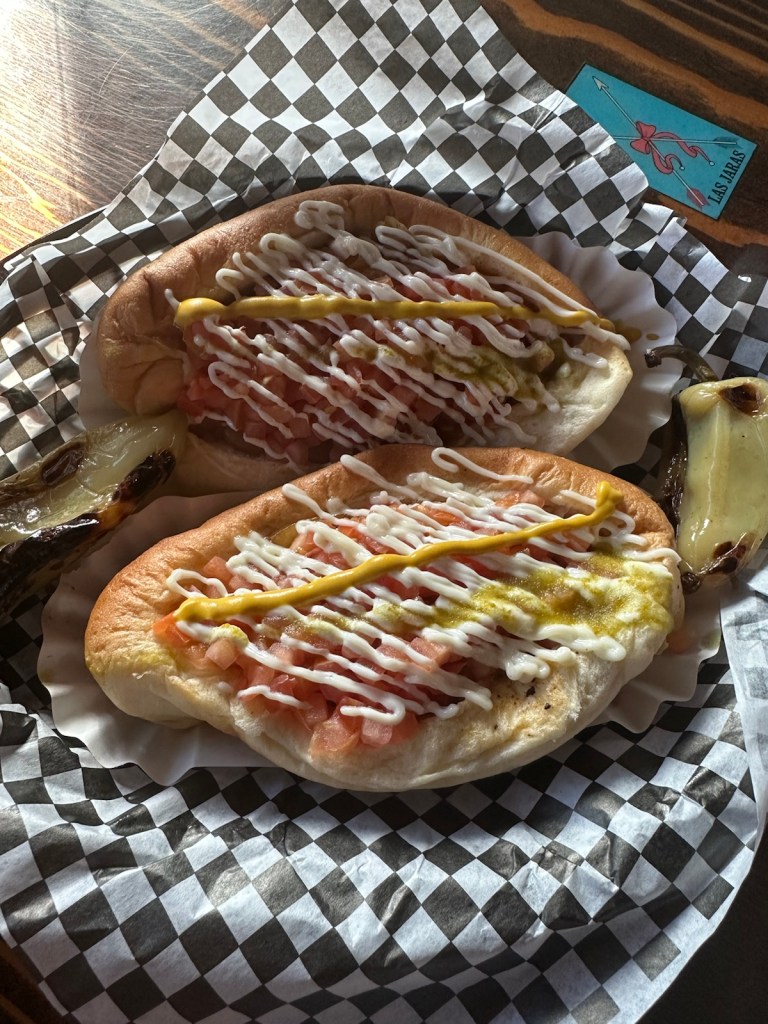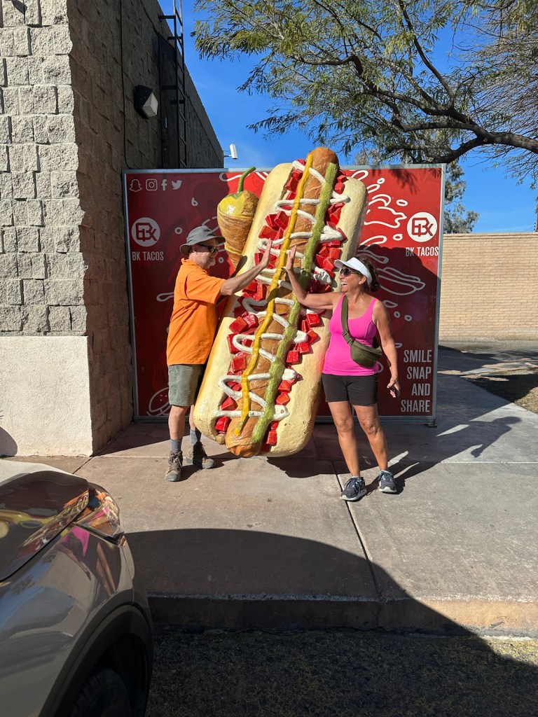 Sonoran Hot Dogs: We needed to try this local delicacy. It consists of a hot dog wrapped in bacon and grilled, served on a bolillo-style hot dog bun, and topped with pinto beans, onions, tomatoes, and a variety of additional condiments, often including mayonnaise, mustard, and jalapeño salsa. It’s an unremarkable set of ingredients that becomes a remarkable taste when it all comes together.
