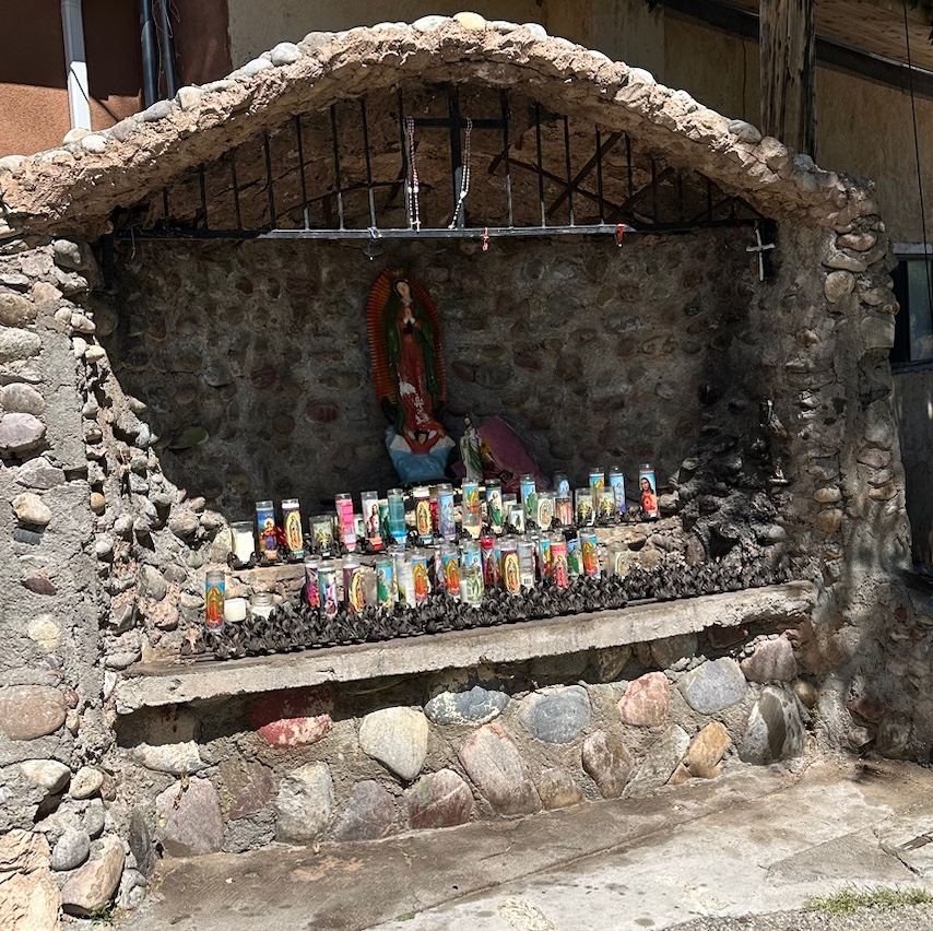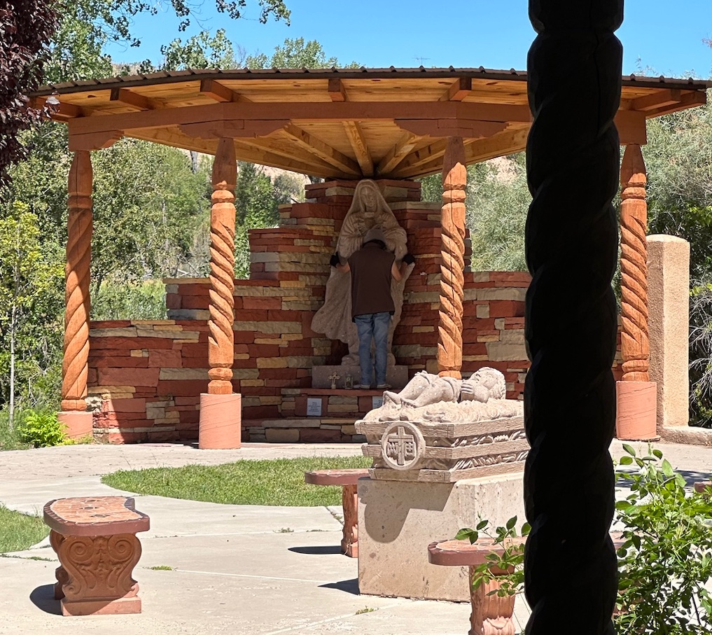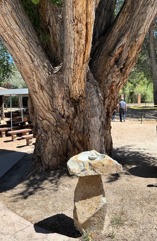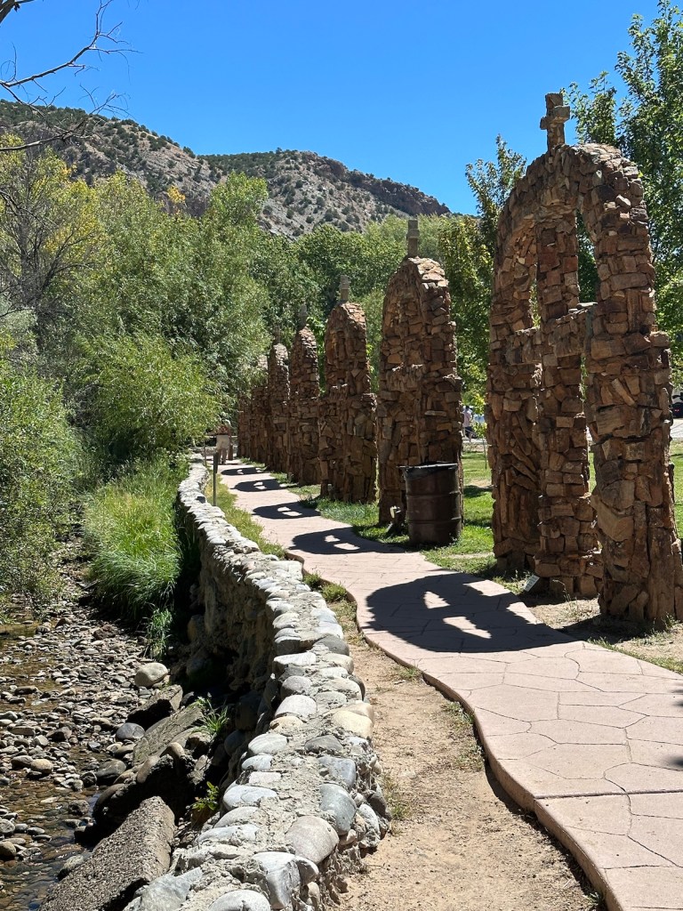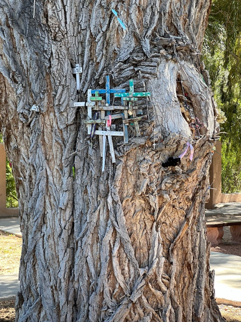 One could spend quite a bit of time wandering the property of El Sanctuario de Chimayo. Pathways lead in various directions and some went down to a pleasant green space filled with beautiful gardens, shrines, grand old trees, a creek and view of the mountains. Over 300,000 people visit this National Historic Landmark each year, many are on pilgrimages.